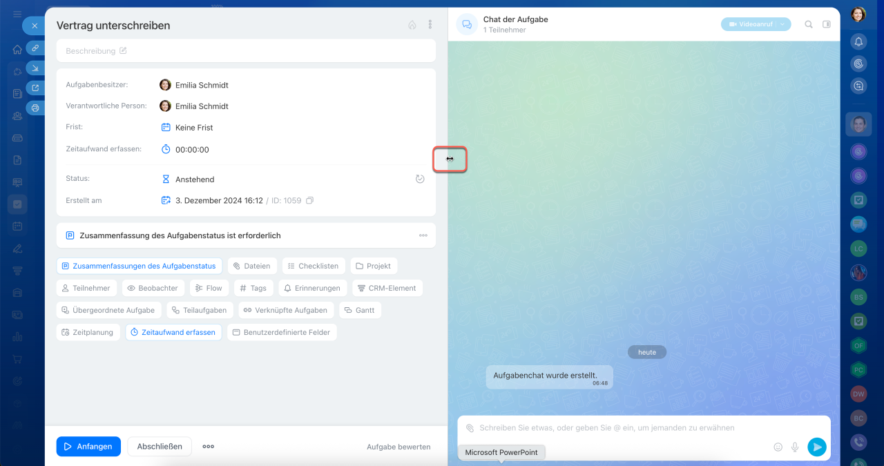 Sie können jedoch die Breite des Chats anpassen: Ziehen Sie den Trennstrich zwischen den Bereichen. Die gewählte Breite wird automatisch für alle Aufgaben gespeichert.
