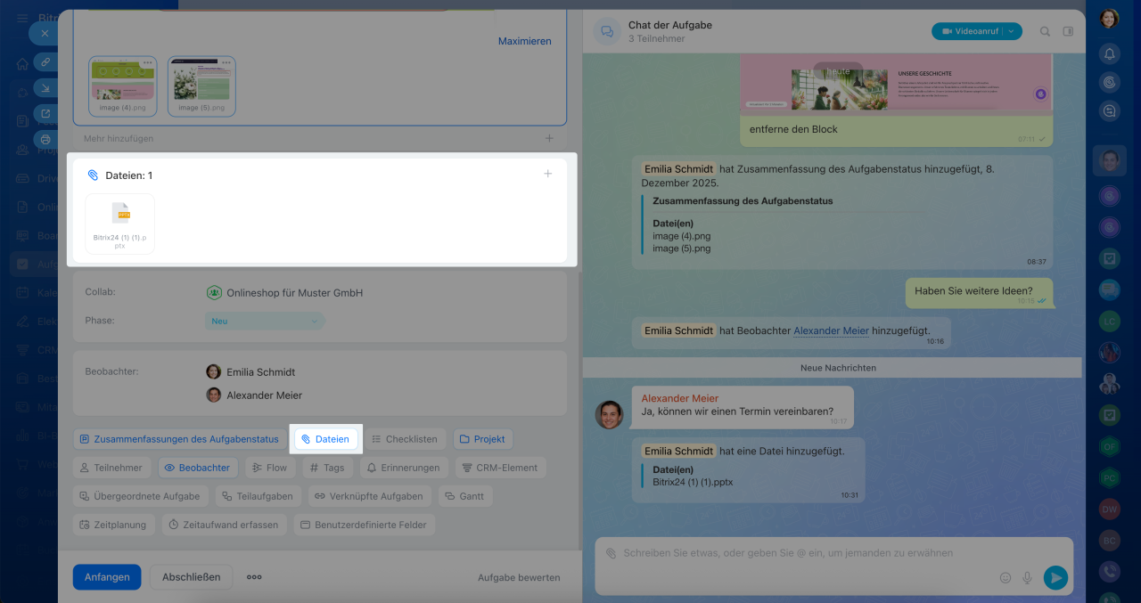 Dateien, die im Aufgabenchat versendet werden, bleiben ausschließlich dort gespeichert. Im Bereich Dateien werden nur Dokumente angezeigt, die direkt über das Aufgabenformular hochgeladen wurden.