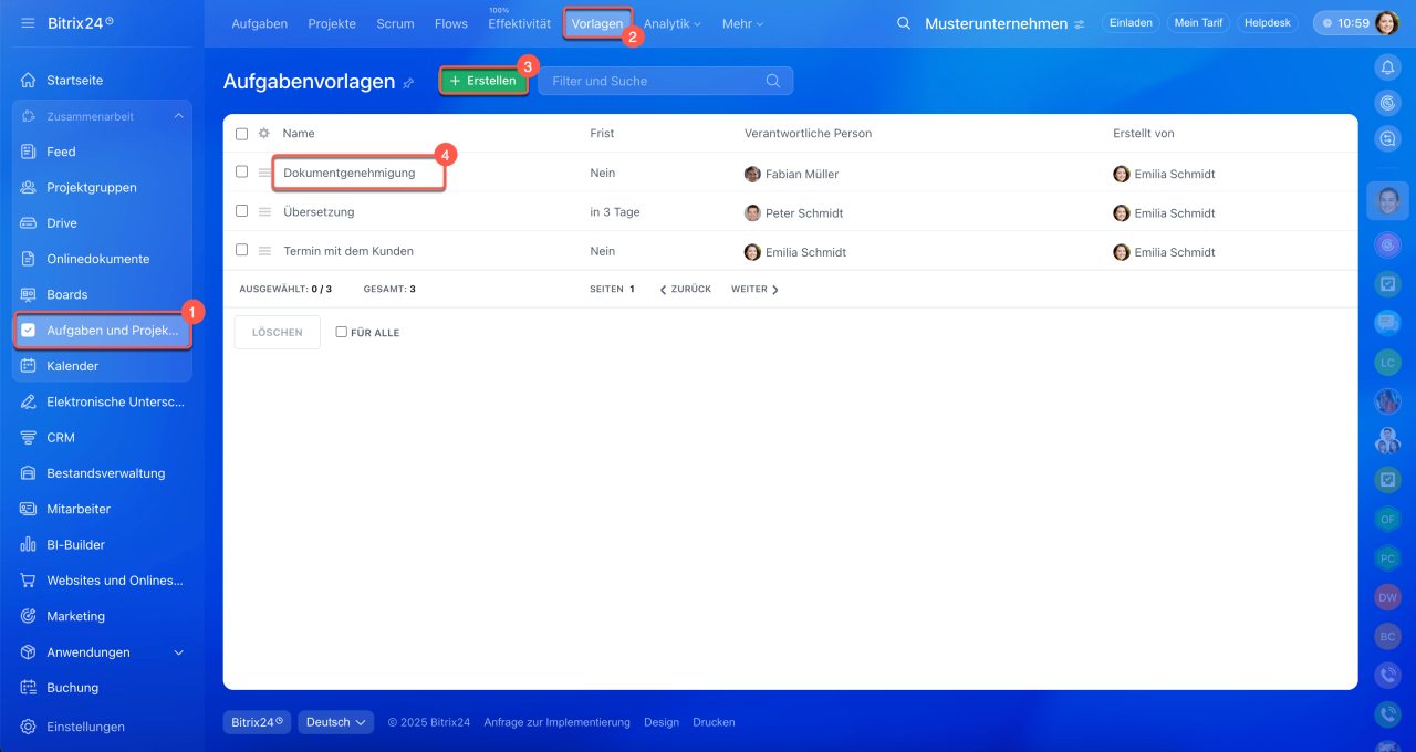 1–2. Öffnen Sie den Bereich Aufgaben und Projekte > Vorlagen.