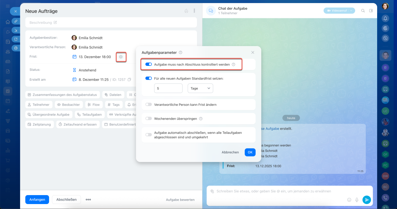 Im Aufgabenformular klicken Sie auf Einstellungen (⚙️) neben dem Feld Frist und aktivieren die Option Aufgabe muss nach Abschluss kontrolliert werden.