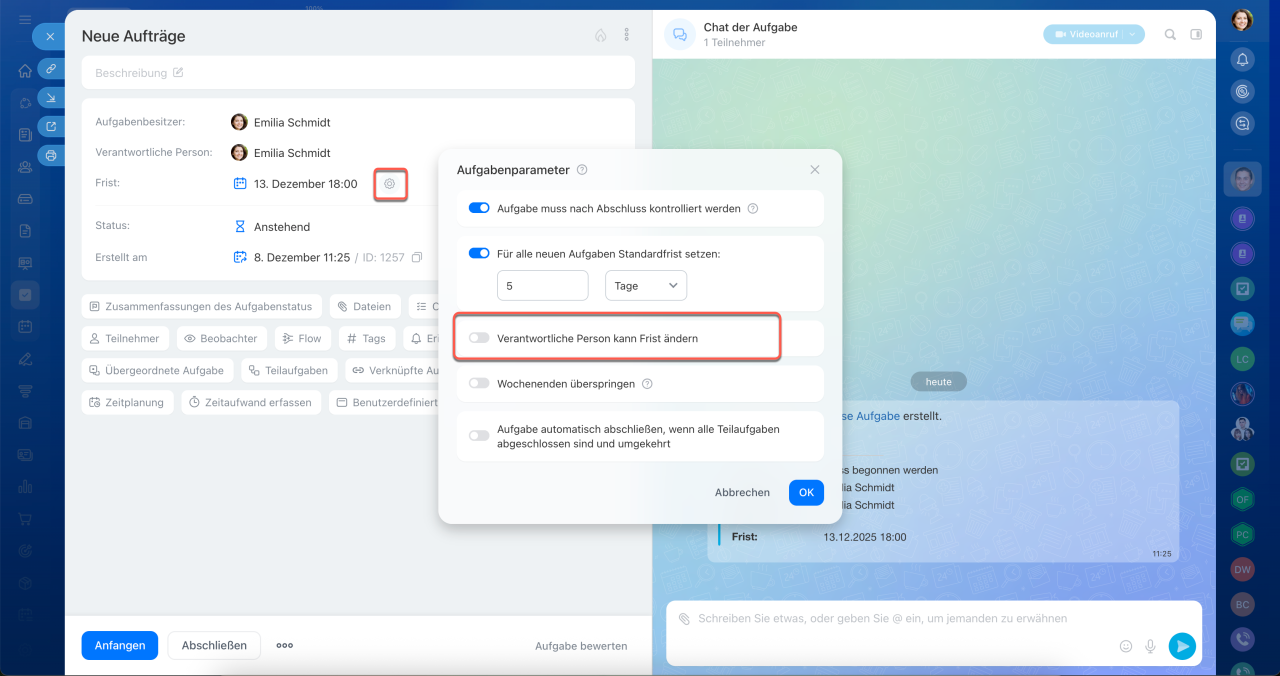 Öffnen Sie die Aufgabe, klicken Sie auf Einstellungen (⚙️) neben dem Feld Frist und deaktivieren Sie die Option Verantwortliche Person kann Frist ändern.