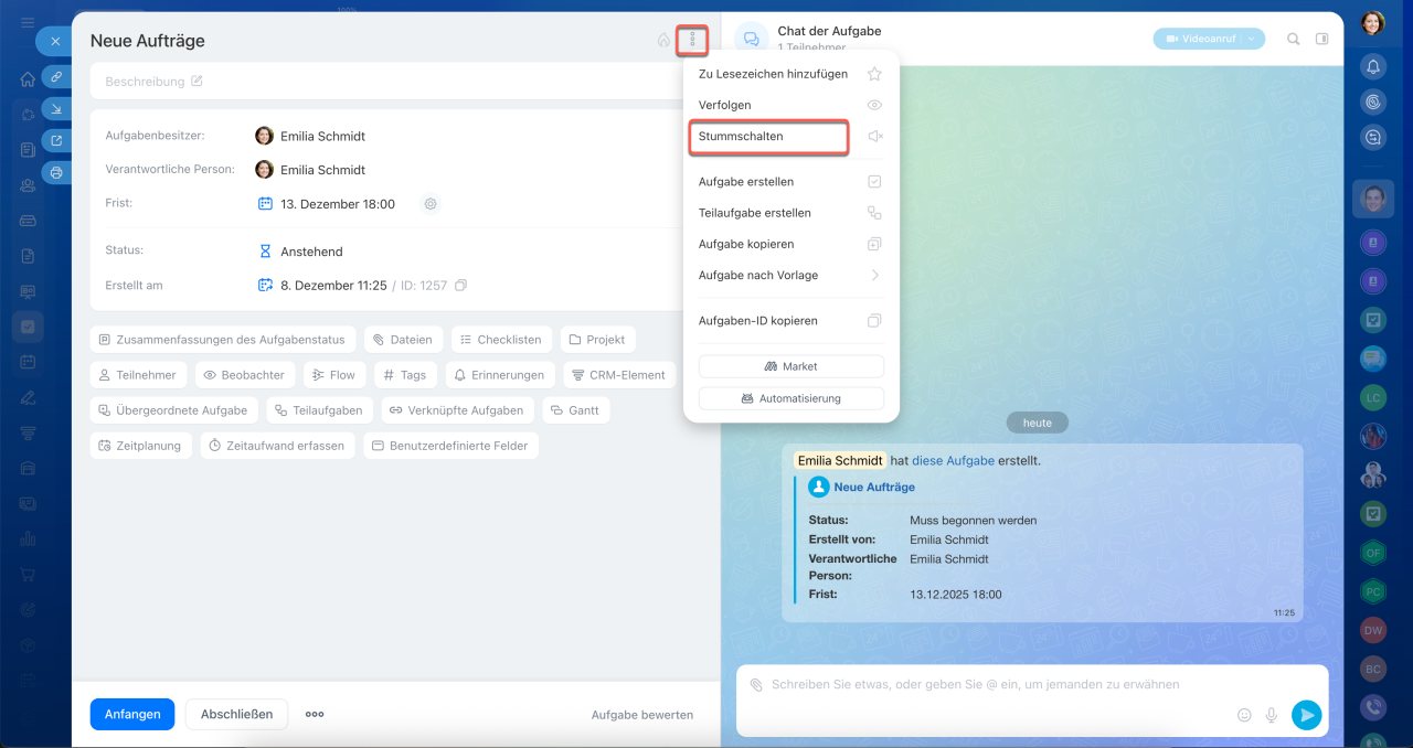 Der Ton im Aufgabenchat hängt von den Benachrichtigungen in der Aufgabe selbst ab. Wenn Sie die Benachrichtigungen für die Aufgabe deaktivieren, wird der Chat ebenfalls stummgeschaltet. Um Benachrichtigungen zu deaktivieren, öffnen Sie die Aufgabe, klicken Sie auf das Symbol