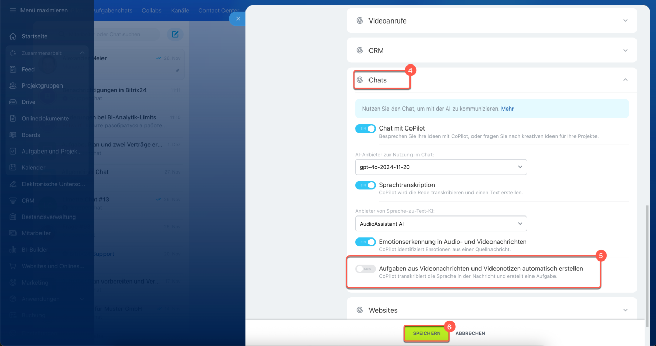 Der Bitrix24-Administrator kann die automatische Erstellung von KI-Aufgaben aus Sprach- und Videonachrichten deaktivieren.