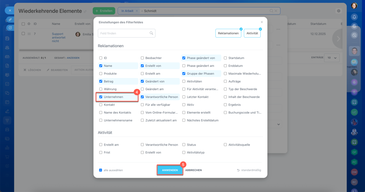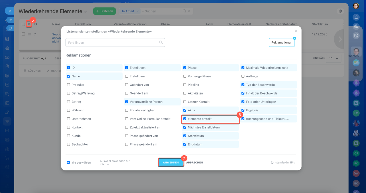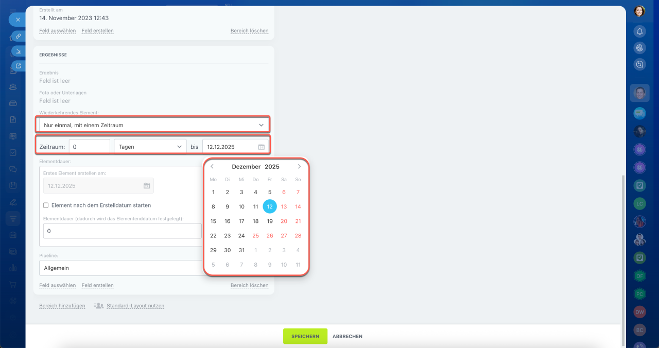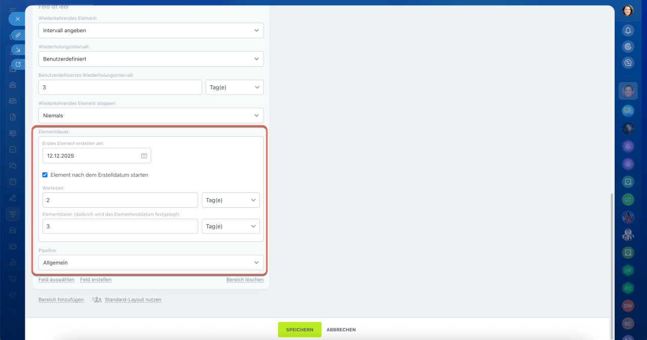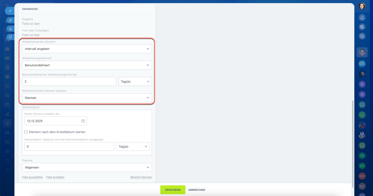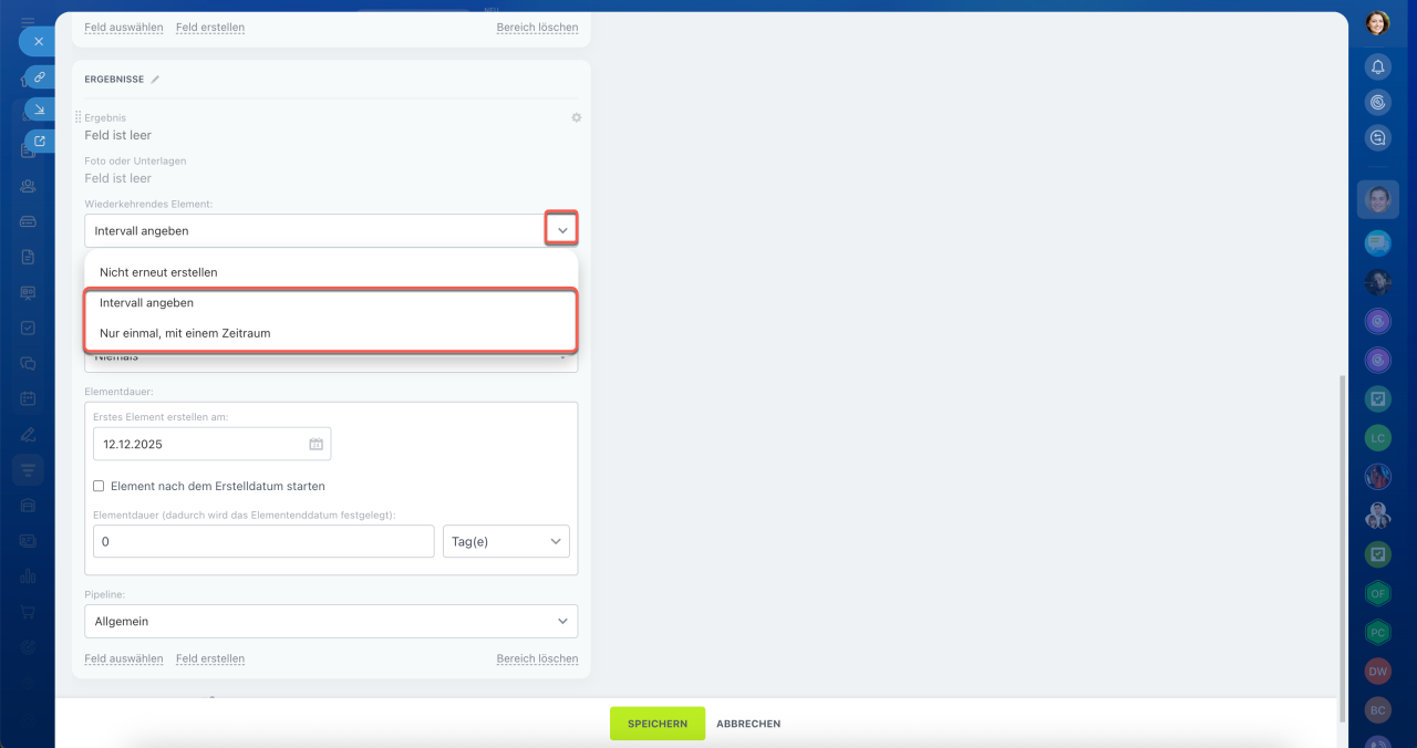 - Intervall angeben – CRM erstellt automatisch Elemente nach Zeitplan. Zum Beispiel jede Woche oder jeden Monat.