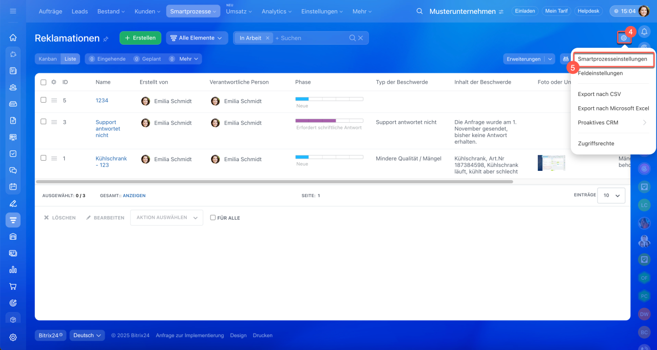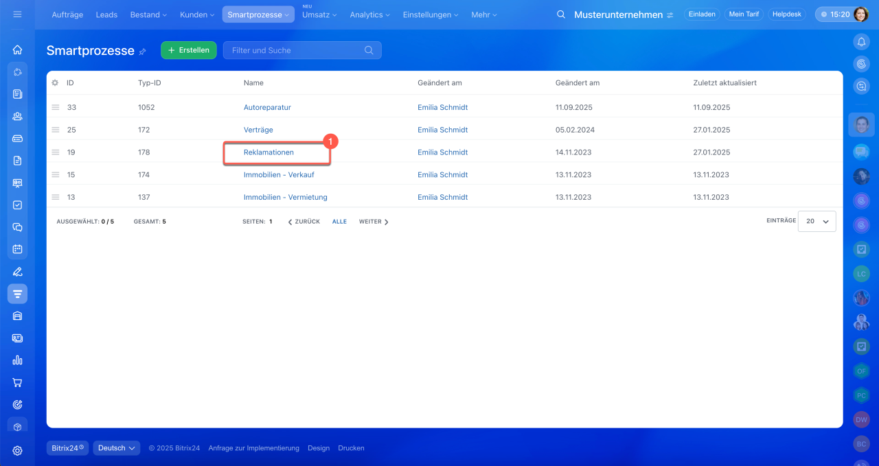 1–3. Öffnen Sie den Bereich CRM > Smartprozesse und wählen Sie den gewünschten Smartprozess aus.