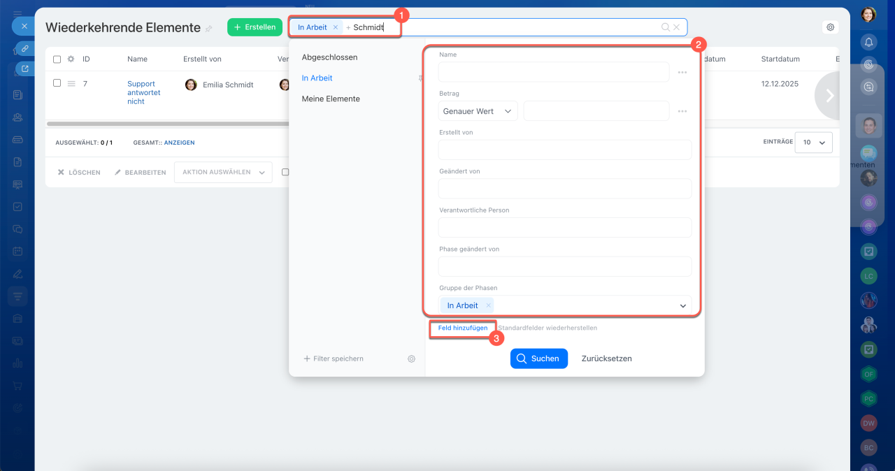 2. Um die Suche einzuschränken, fügen Sie Filter hinzu – klicken Sie erneut auf die Suchleiste und füllen Sie die Felder aus. Geben Sie zum Beispiel den Namen des Elements oder den Nachnamen des Mitarbeiters an, der es aktualisiert hat.