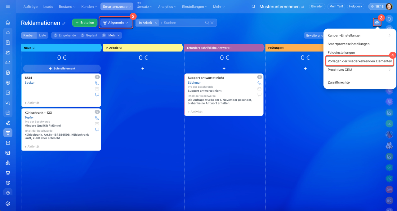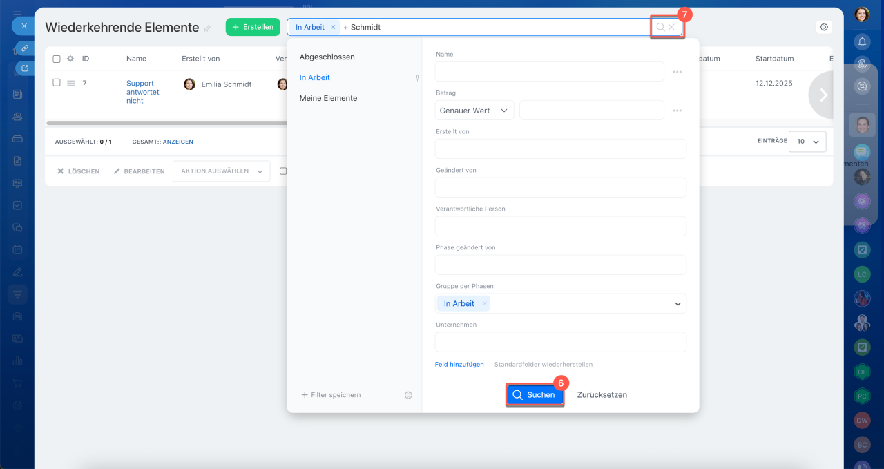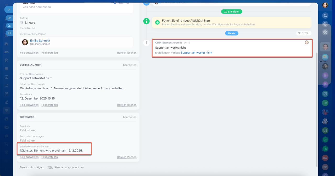 Wiederkehrende Elemente in Smartprozessen helfen dabei, regelmäßige Aktionen nicht zu vergessen – sowohl innerhalb des Unternehmens als auch in der Zusammenarbeit mit Kunden. Bitrix24 erstellt solche Elemente automatisch nach dem von Ihnen festgelegten Zeitplan, zum Beispiel monatlich für die Lagerinventur oder vierteljährlich für geplante Wartungsarbeiten. Dies reduziert Routineaufgaben und stellt sicher, dass wichtige Schritte nicht übersehen werden.