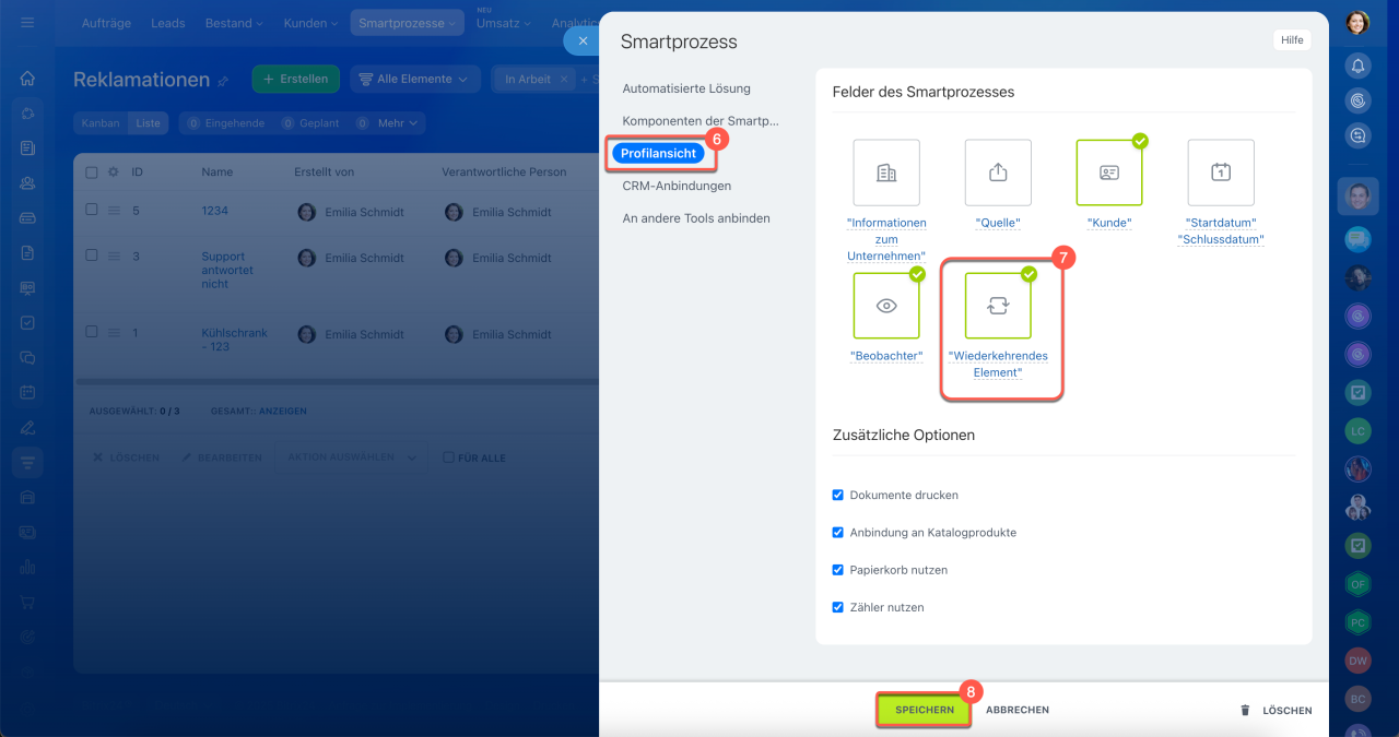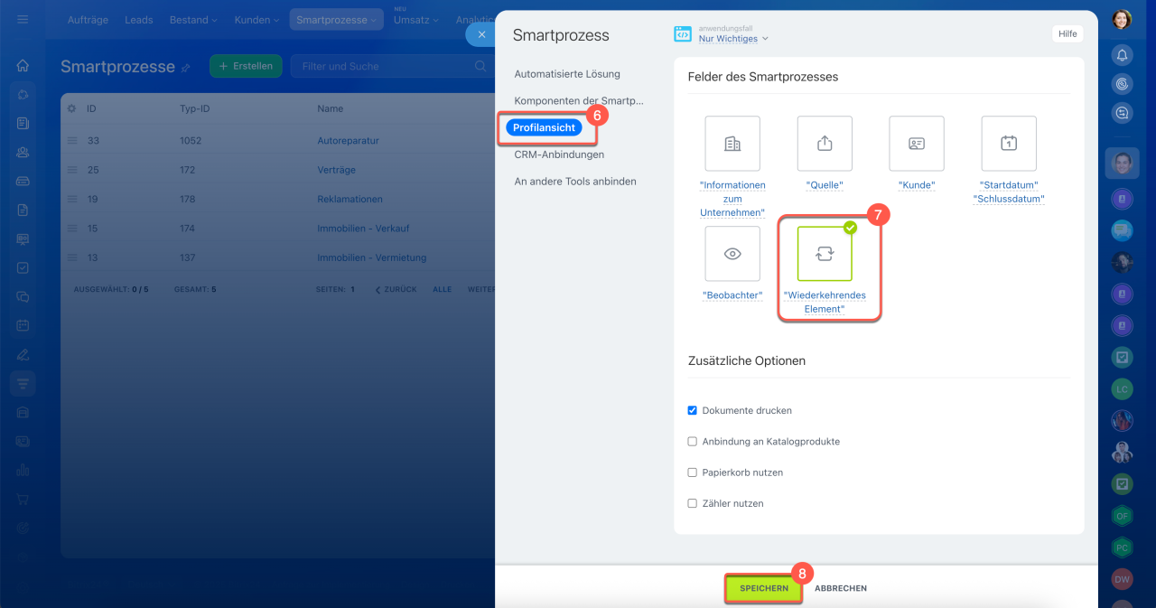 6–7. Öffnen Sie den Tab Profilansicht und aktivieren Sie im Block Felder des Smartprozesse die Option Wiederkehrendes Element.
