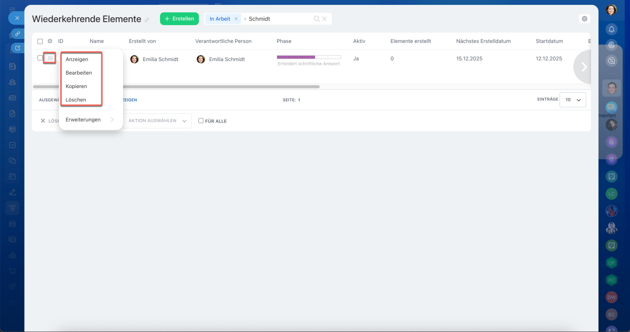 Nach der Erstellung eines wiederkehrenden Elements speichert das CRM es als Vorlage. Alle diese Vorlagen werden in einer Liste gesammelt — getrennt nach jedem Smartprozess und jeder Pipeline. In dieser Liste können Sie die wichtigsten Informationen einsehen, benötigte Vorlagen suchen und diese verwalten.