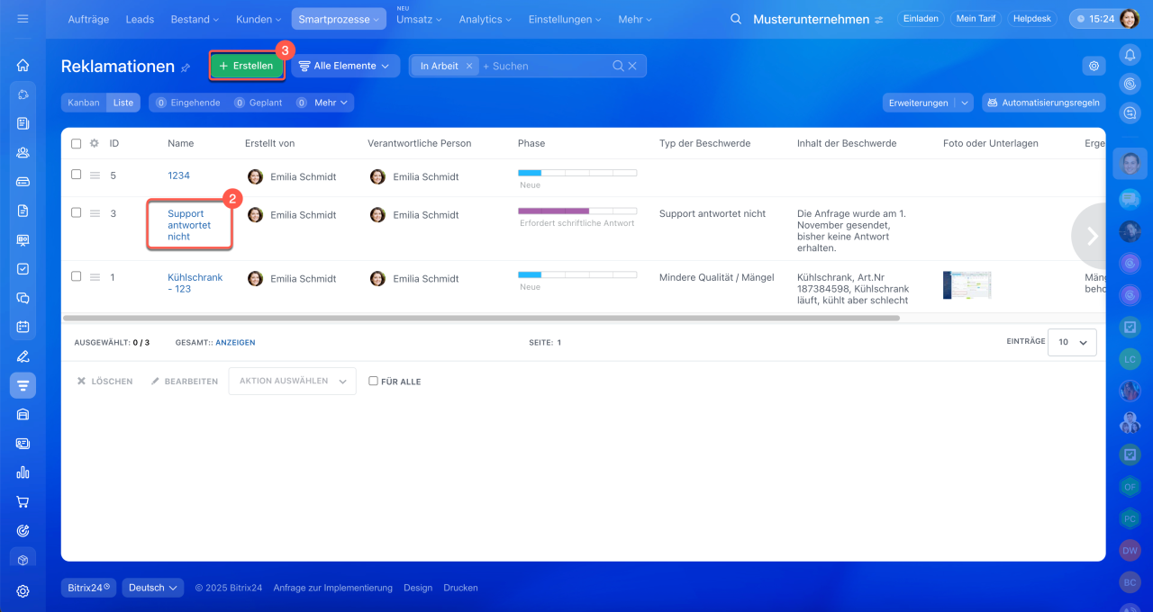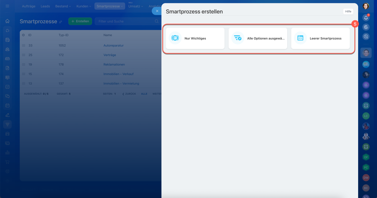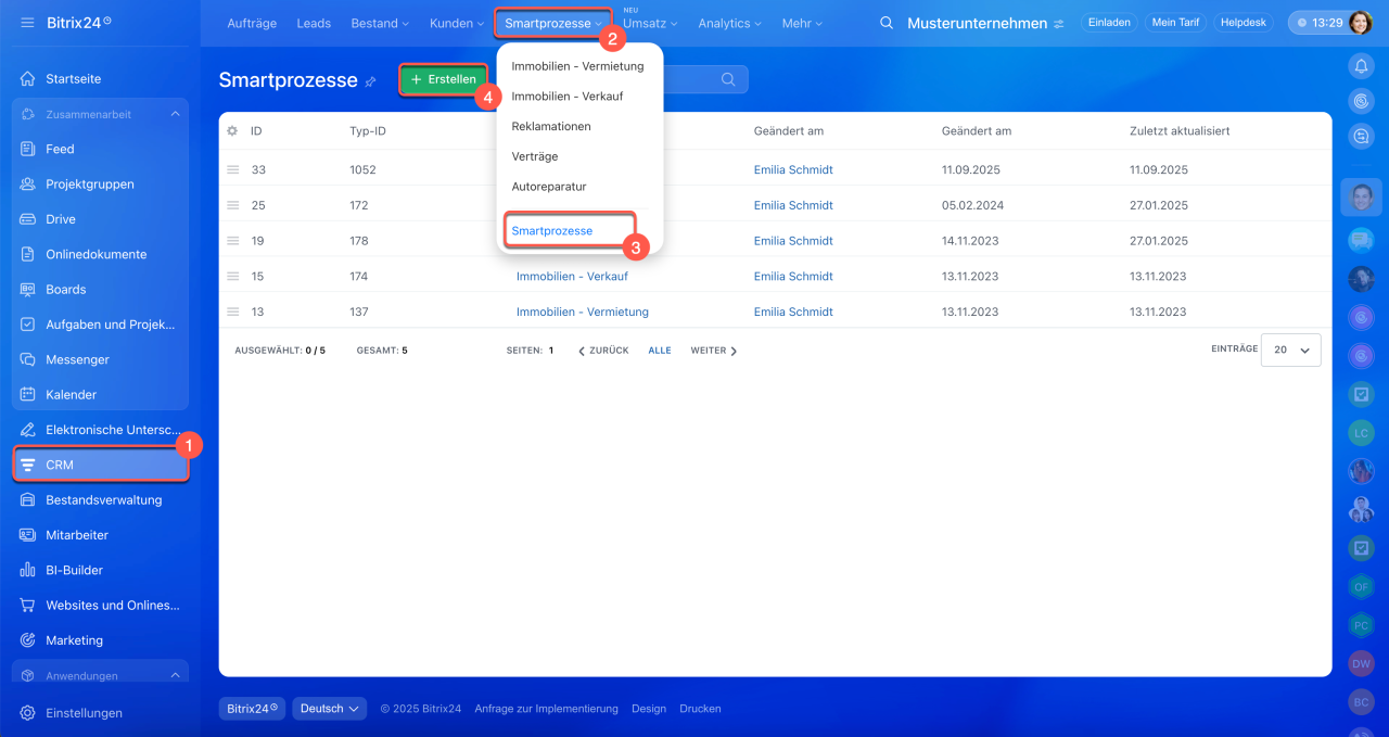 1–4. Öffnen Sie den Bereich CRM > Smartprozesse > Smartprozesse und klicken Sie auf Erstellen.