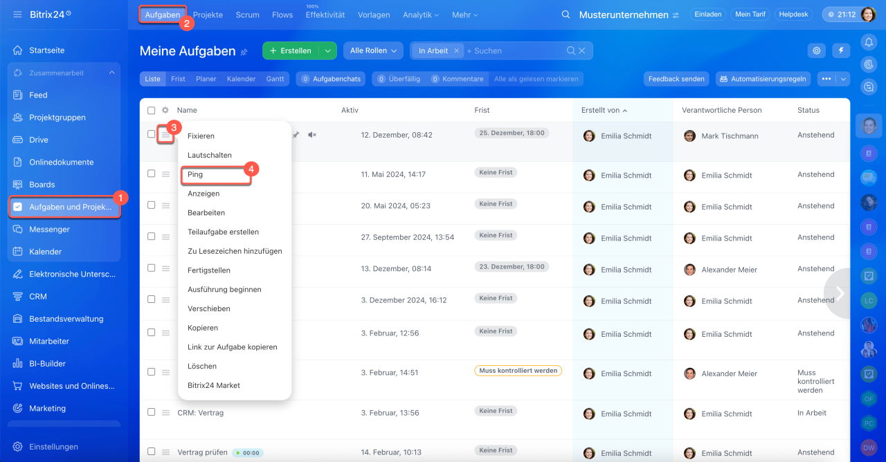 Öffnen Sie den Bereich Aufgaben und Projekte > Aufgaben, wählen Sie die gewünschte Aufgabe aus, öffnen Sie das Menü (≡) und klicken Sie auf Ping. Die verantwortliche Person und die Mitwirkenden erhalten eine Benachrichtigung, dass Sie den Status der Aufgabe angefragt haben. Im Aufgaben-Chat erscheint eine Systemnachricht.