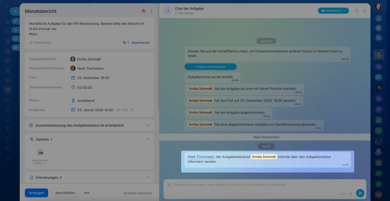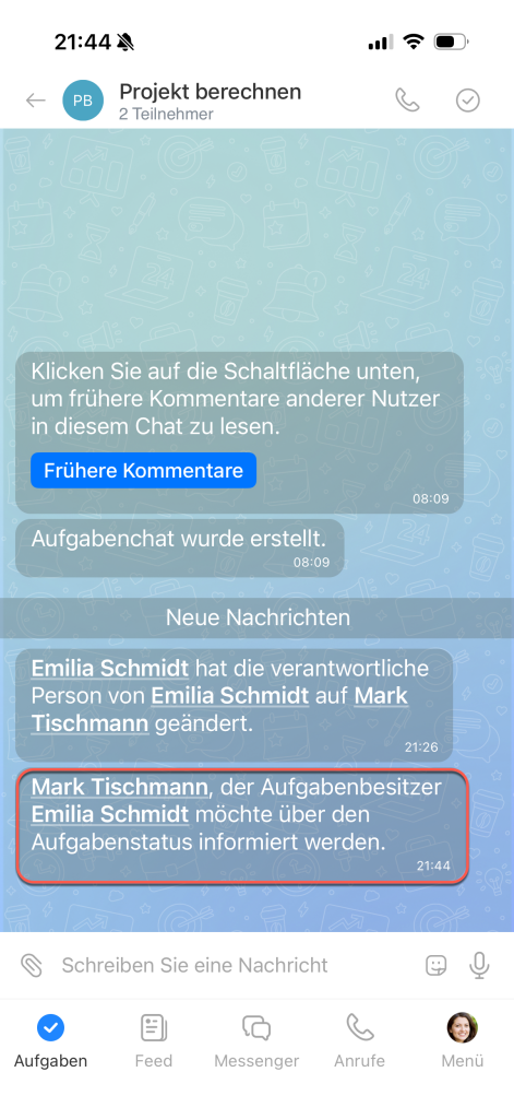 - Verantwortliche Person und Mitwirkende erhalten eine Benachrichtigung über den Ping und sehen ihn als Systemnachricht im Aufgaben-Chat.