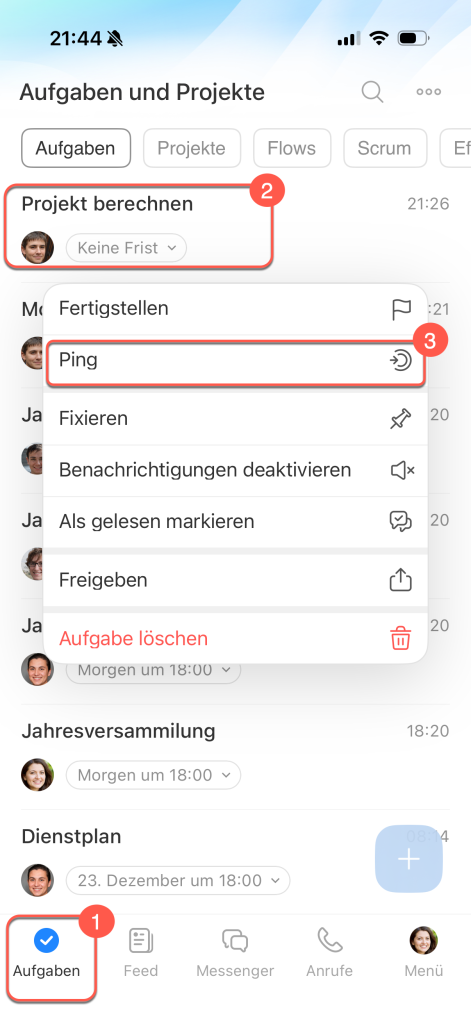 - Einen Ping können Sie direkt aus der Aufgabenliste versenden: in der Webversion über das Aufgabenmenü, in der mobilen App durch langes Antippen der Aufgabe.