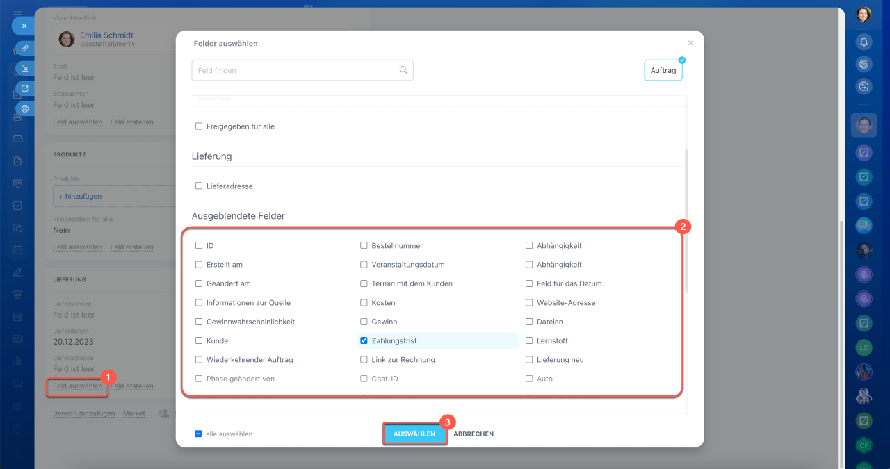 Vorhandenes Feld hinzufügen. Falls im Bereich benötigte Daten fehlen, können Sie ein passendes Feld aus der Liste auswählen. Sie können zum Beispiel das Feld „Zahlungsfrist“ hinzufügen.