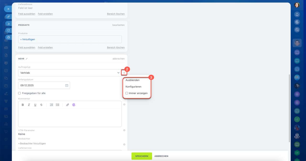 3. Blenden Sie das Feld aus oder passen Sie seine Einstellungen an. Sie können beispielsweise die Option Immer anzeigen aktivieren, damit das Feld auch dann sichtbar bleibt, wenn es leer ist, oder es als Pflichtfeld kennzeichnen – die Speicherung ist nur möglich, wenn das Feld ausgefüllt ist. Bei benutzerdefinierten Feldern können Sie zudem einen Hinweis hinzufügen oder das Feld für bestimmte Mitarbeiter ausblenden.