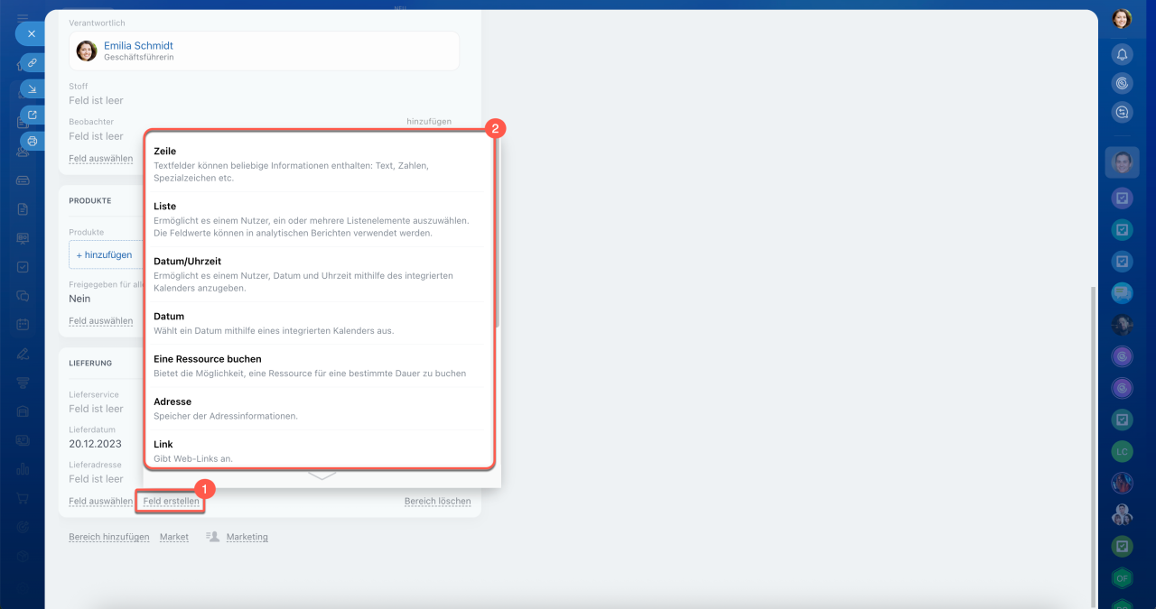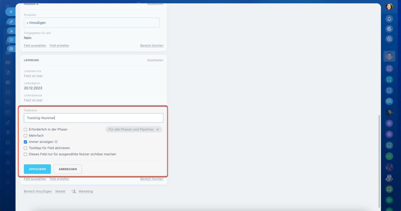 4. Speichern Sie das Feld – es erscheint im Formular des CRM-Elements.