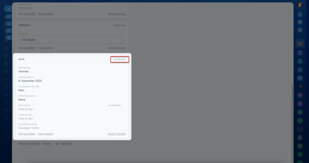 Felder in einem Bereich bearbeiten. In jedem Bereich können Sie Felder ausblenden, die nicht benötigt werden, oder deren Darstellung anpassen. So bleiben nur die relevanten Informationen sichtbar. Jedes Feld kann später wieder eingeblendet werden.