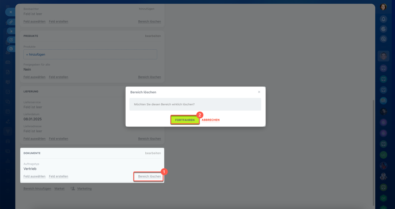 Bereich löschen. Wenn ein Bereich nicht mehr benötigt wird, löschen Sie ihn. Die Felder aus diesem Bereich werden nicht gelöscht, sondern nur ausgeblendet. Bei Bedarf können Sie die Felder in einen anderen Bereich des Formulars verschieben.