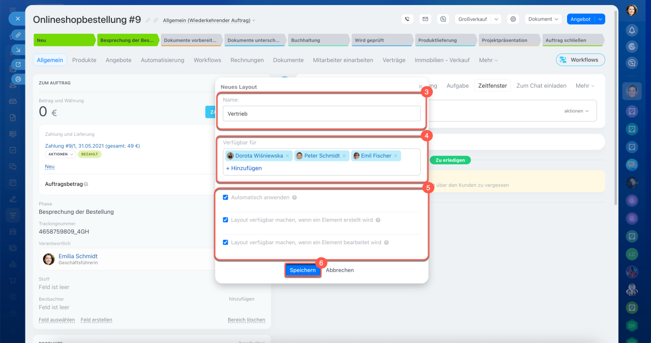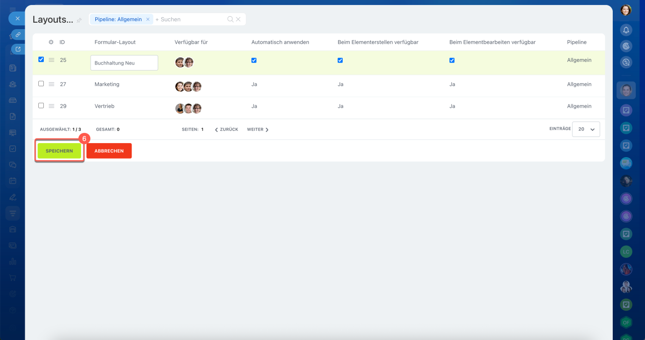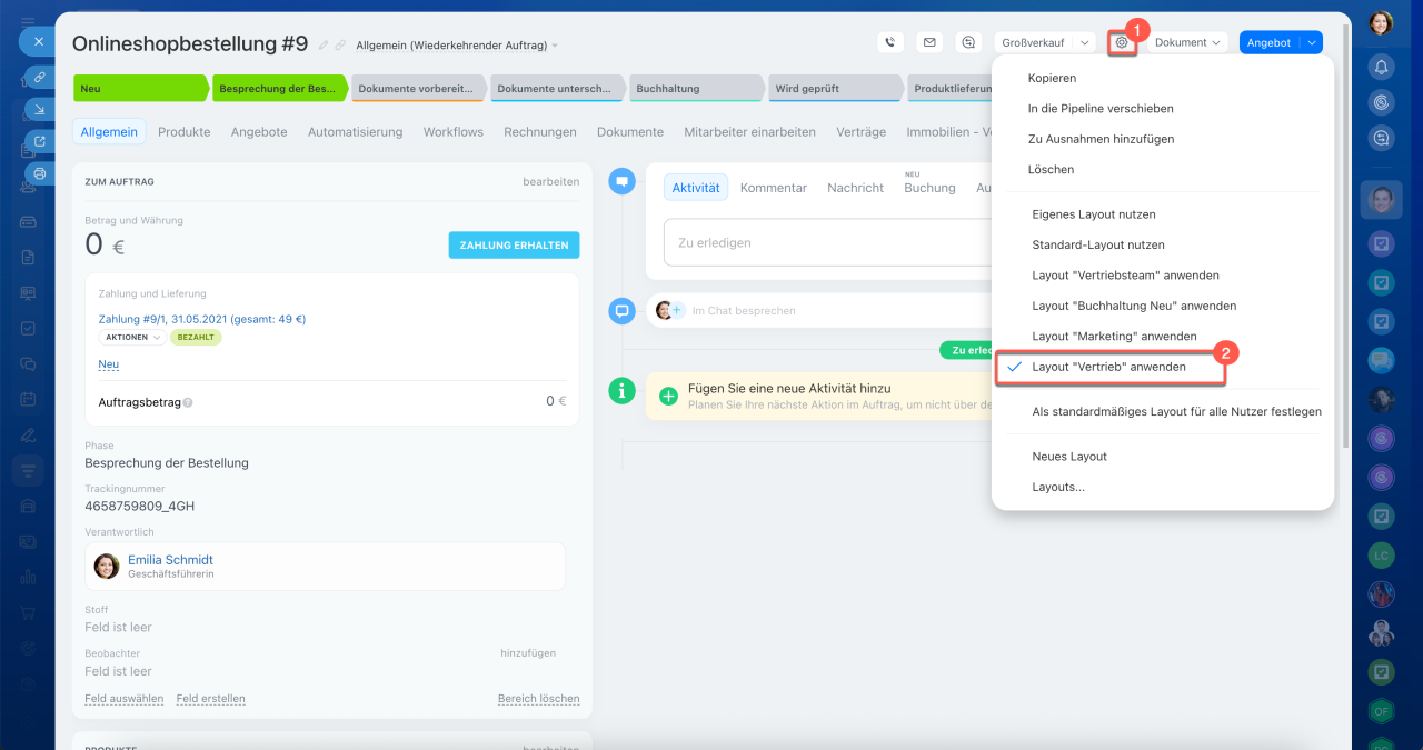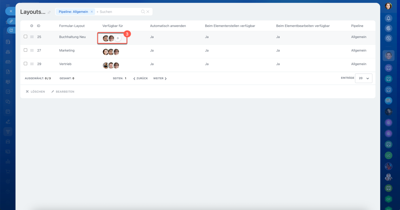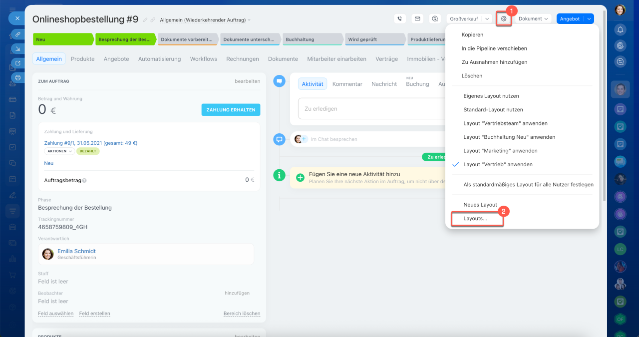 1–2. Öffnen Sie das CRM-Element und klicken Sie auf Einstellungen (⚙️) > Layouts, um die Liste der verfügbaren Layouts und zugeordneten Mitarbeiter anzuzeigen.