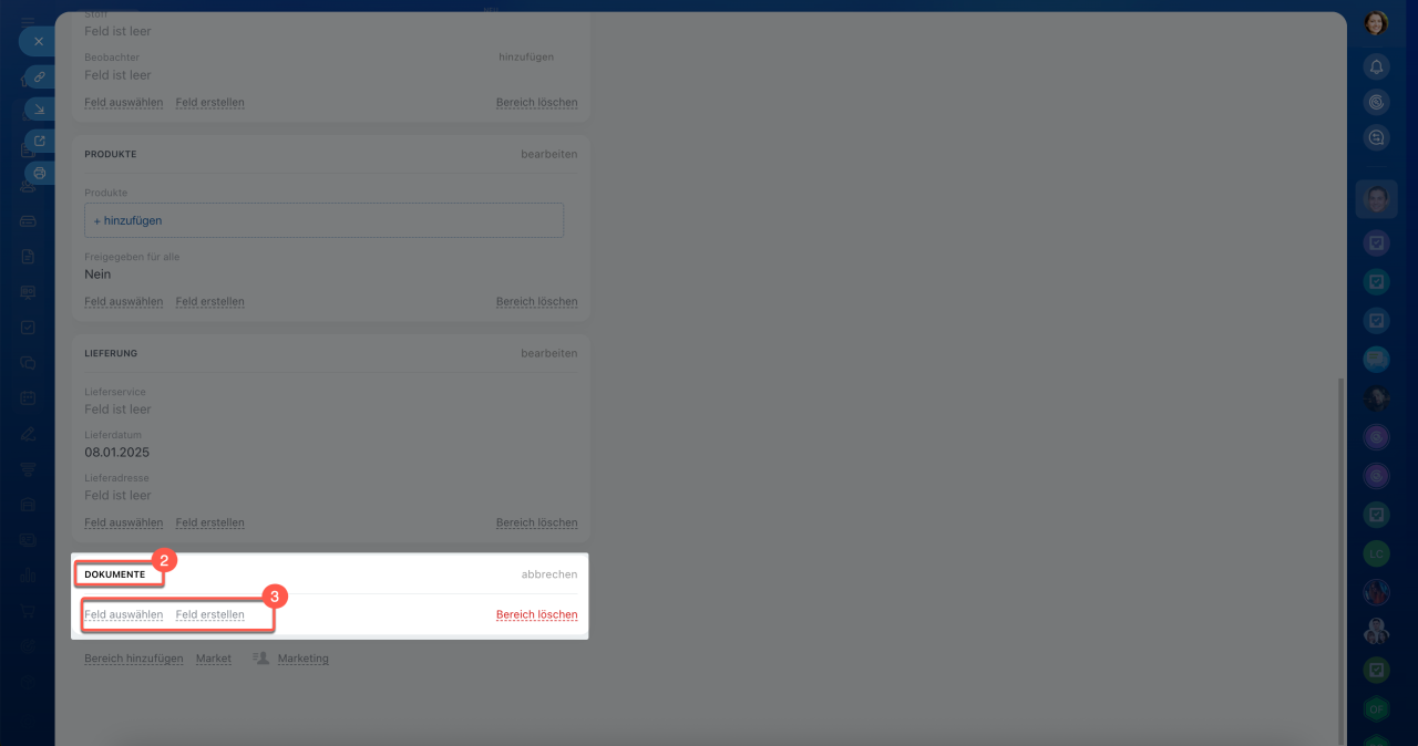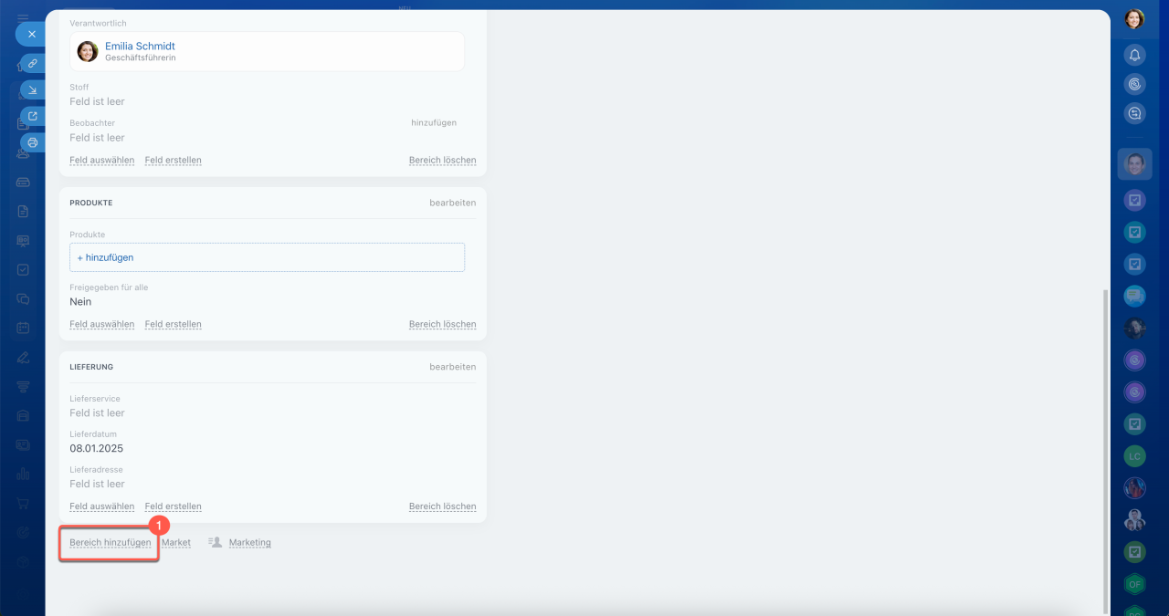 Neuen Bereich erstellen. Erstellen Sie einen Bereich, wenn Mitarbeiter einen separaten Block mit Informationen benötigen. Zum Beispiel können Sie den Bereich „Dokumente“ mit den Feldern „Vertragsnummer“ und „Unterzeichnungsdatum“ erstellen.