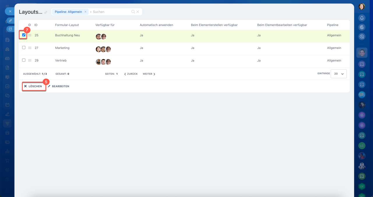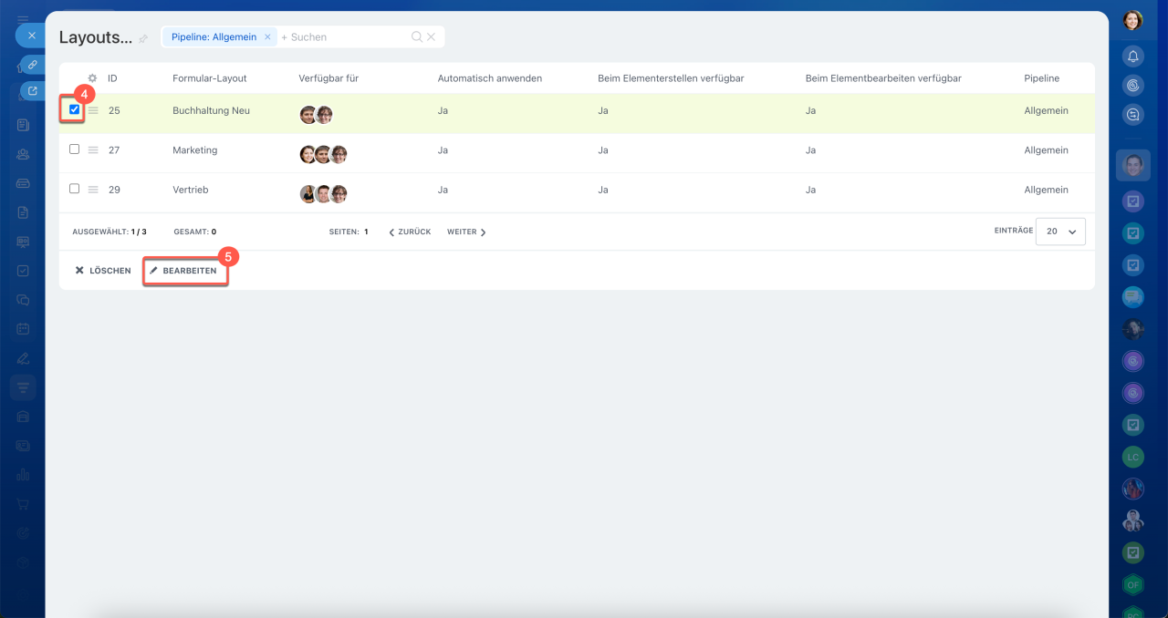 - Die Formular-Layouts können auch direkt im CRM-Element im Bereich Einstellungen (⚙️) > Layouts geändert oder gelöscht werden.