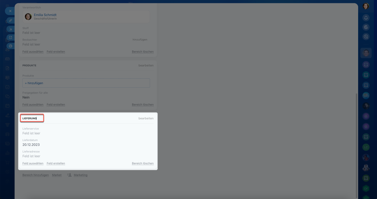 Bereich umbenennen. Der Name des Bereichs sollte klar erkennbar sein, welche Informationen er enthält. Falls der aktuelle Name nicht aussagekräftig ist, können Sie ihn ändern. Wenn Sie beispielsweise mit Warenlieferungen arbeiten, können Sie den Bereich „Sonstiges“ in „Lieferung“ umbenennen und Felder wie „Adresse“ oder „Lieferdatum“ hinzufügen.