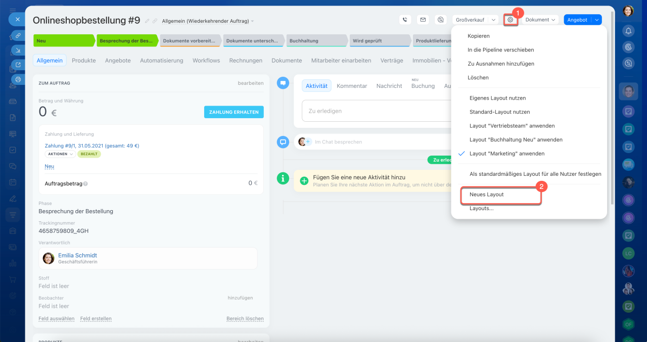 - Neue Layouts werden direkt im CRM-Element erstellt – klicken Sie auf Einstellungen (⚙️) > Neues Layout.
