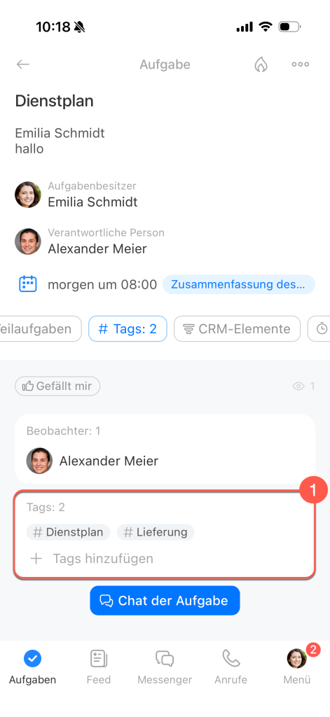 Die ausgewählten oder hinzugefügten Tags werden im Aufgabenformular angezeigt.