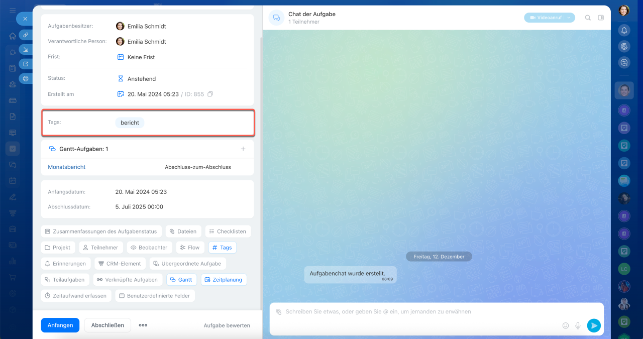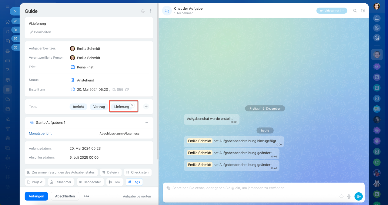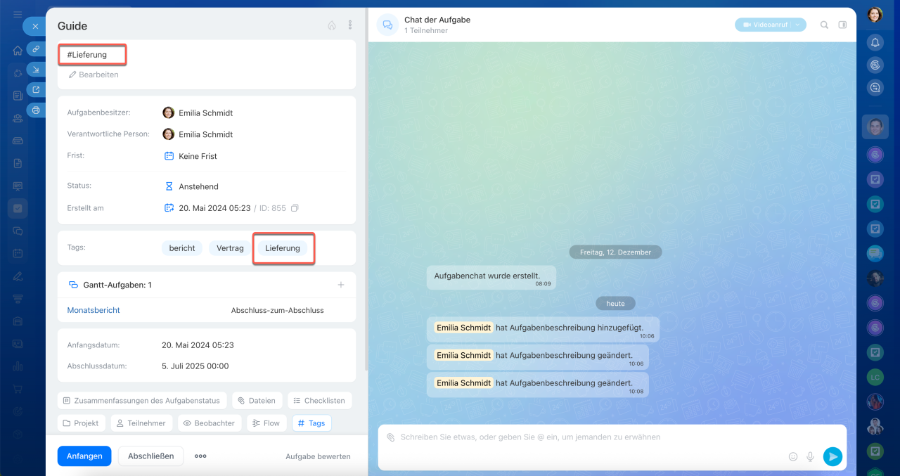 Tags können auch direkt in der Aufgabenbeschreibung erstellt werden. Geben Sie ein Wort mit dem Zeichen # ein, z. B. #Vertrag. Bitrix24 erkennt es automatisch als Tag und fügt es der allgemeinen Liste hinzu.