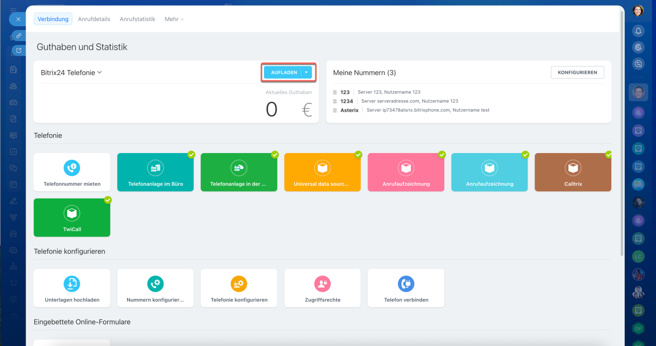 Bei Nutzung des SIP-Konnektors erfolgen die Abrechnungen für Anrufe direkt über den Anbieter Ihrer Telefonanlage. Eine separate Auffüllung des Guthabens in Bitrix24 ist nicht erforderlich.
