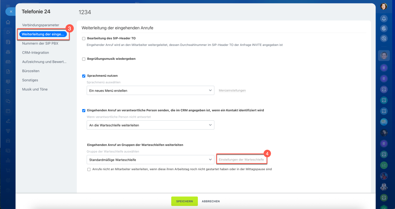 Ein Rückruf aus dem CRM-Formular wird an die Mitarbeiter weitergeleitet, die in den Nummereinstellungen unter Telefonie > Nummern konfigurieren > Weiterleitung eingehender Anrufe > Einstellungen der Warteschleife hinterlegt sind – nicht an die für das Formular verantwortliche Person.