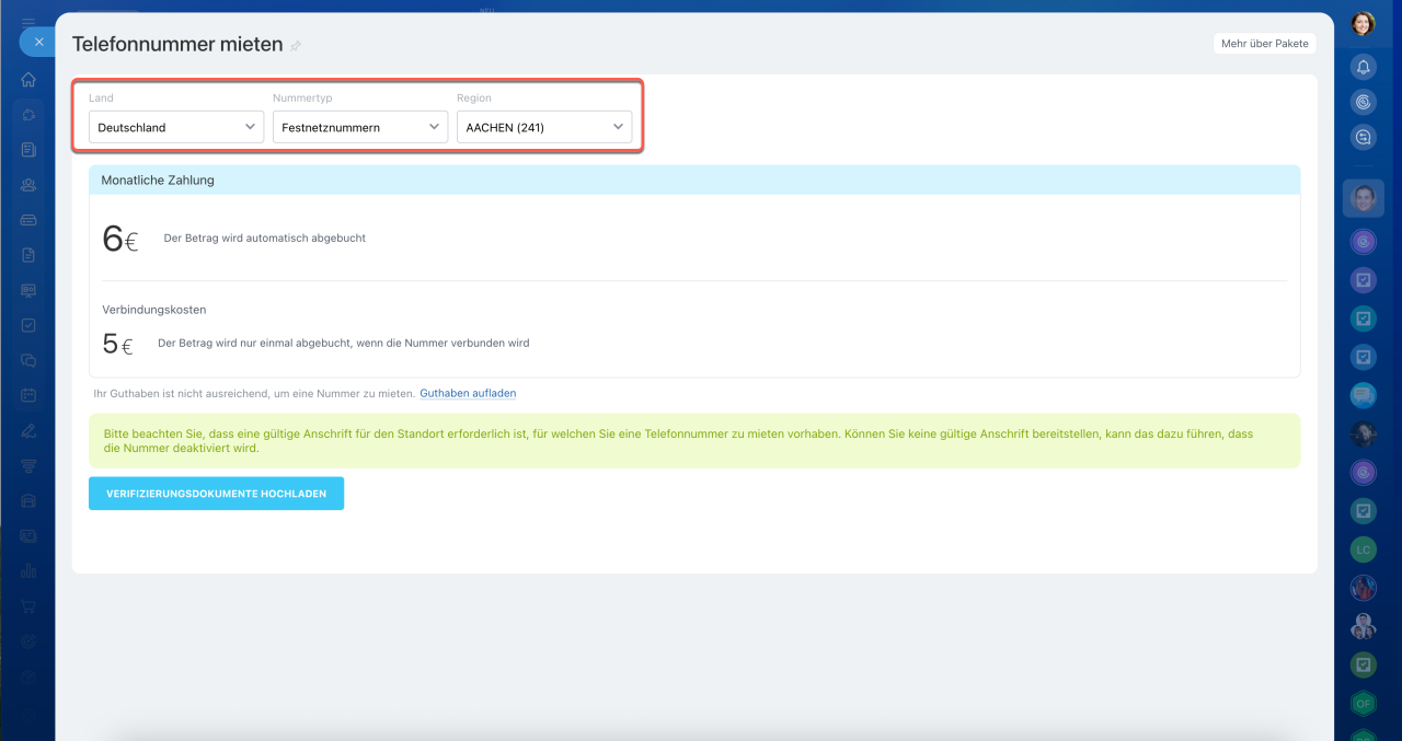 Kosten für die Nummernmiete: Die Preise für die Miete von Rufnummern finden Sie unter CRM > Kunden > Contact Center > Telefonie > Telefonnummer mieten. Wählen Sie dort das gewünschte Land, die Region und die Art der Nummer aus, um den genauen Preis zu sehen.