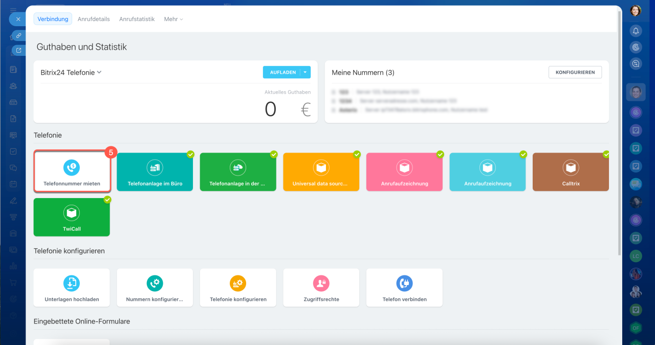 In Bitrix24 gibt es keine Begrenzung für die Anzahl der mietbaren Rufnummern. Die Verfügbarkeit hängt davon ab, ob der Anbieter freie Nummern in den gewünschten Ländern, Regionen oder Nummernarten anbietet.