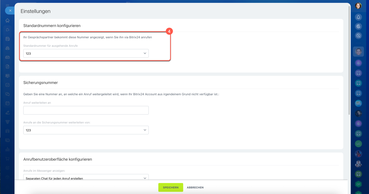 4. Legen Sie unter Standardnummern konfigurieren die gewünschte Nummer für ausgehende Anrufe fest.