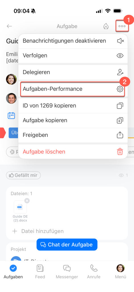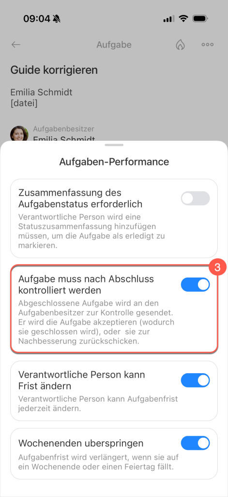 - Um die Option in der mobilen Version zu aktivieren, öffnen Sie die Aufgabe, tippen Sie auf Drei Punkte (...) und wählen Sie Aufgaben-Perfomace. Aktivieren Sie dann die Option Aufgabe muss nach Abschluss kontrolliert werden.