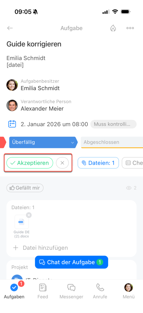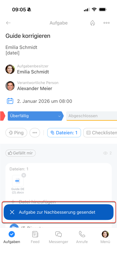- Sobald die verantwortliche Person die Aufgabe abschließt, erhält der Aufgabenersteller eine Benachrichtigung und kann das Ergebnis akzeptieren oder die Aufgabe zur Nachbesserung senden.