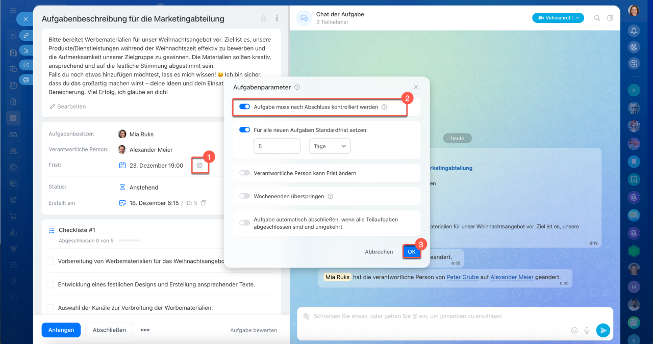 - Bitrix24 bietet eine praktische Funktion: die Option „Aufgabe muss nach Abschluss kontrolliert werden“. Mit dieser Einstellung können Aufgabenersteller sicherstellen, dass Ergebnisse den Anforderungen entsprechen, bevor eine Aufgabe endgültig abgeschlossen wird.
