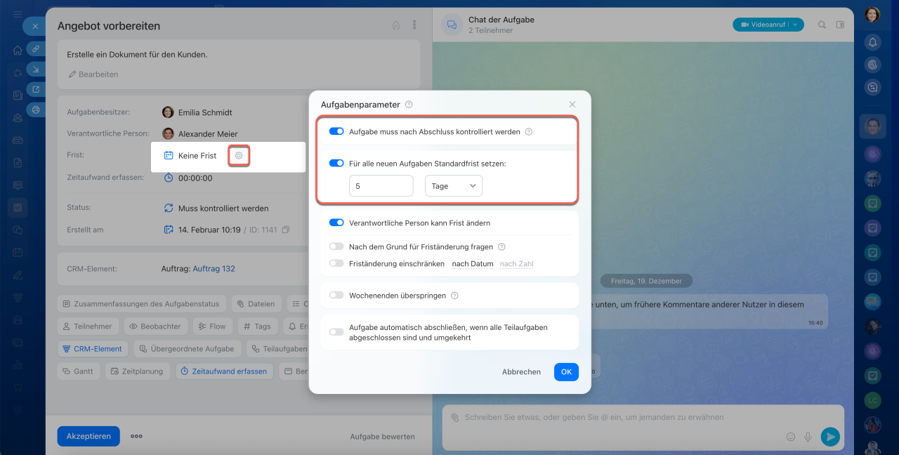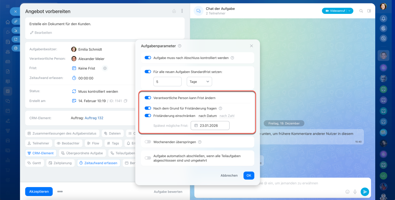 - In den erweiterten Einstellungen bestimmen Sie, wie die Frist behandelt wird: ob sie verschiebbar ist, ob sie bei neuen Aufgaben automatisch übernommen wird oder ob vor Abschluss eine Kontrolle des Ergebnisses nötig ist.
