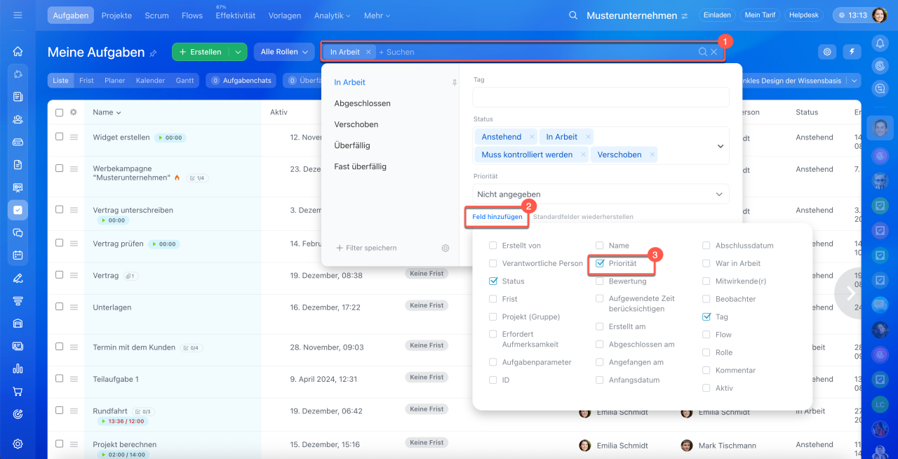 Um nur wichtige Aufgaben in der Liste anzuzeigen, wählen Sie im Filter den Parameter Priorität.
