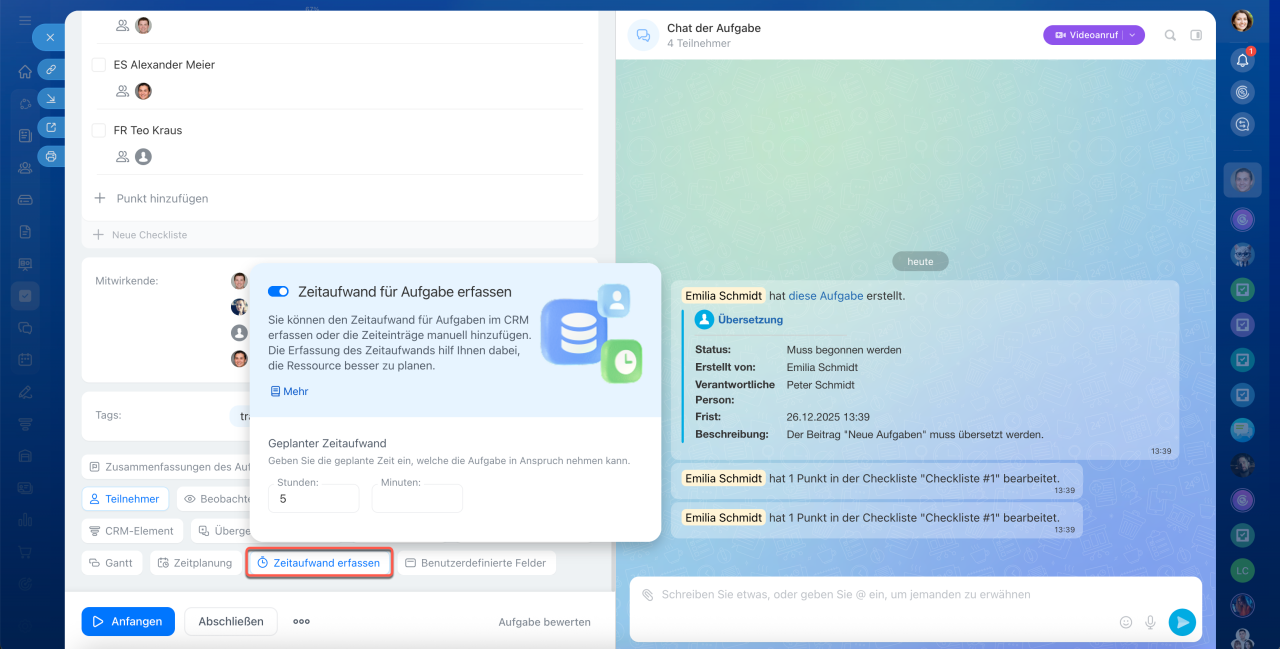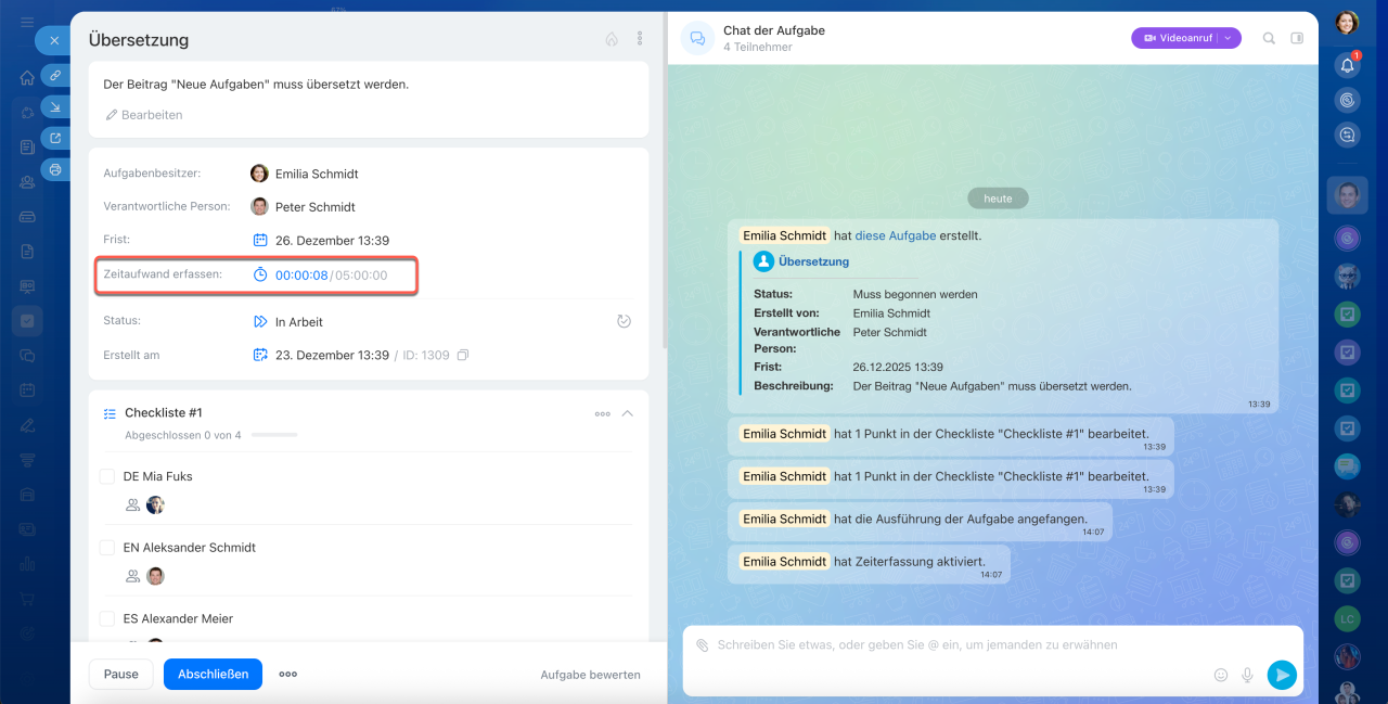Alle Daten werden automatisch in der Aufgabe gespeichert. Die Teilnehmer müssen die Zeit nicht manuell erfassen, und der Ersteller kann leichter sehen, wie lange das Team an der Aufgabe arbeitet und den Beitrag jedes Teilnehmers bewerten.