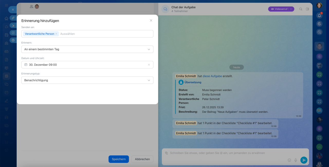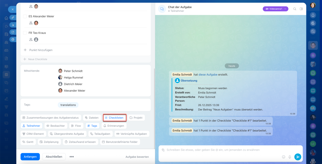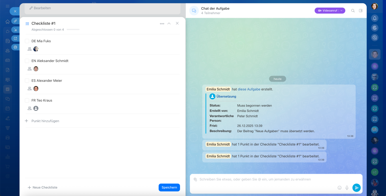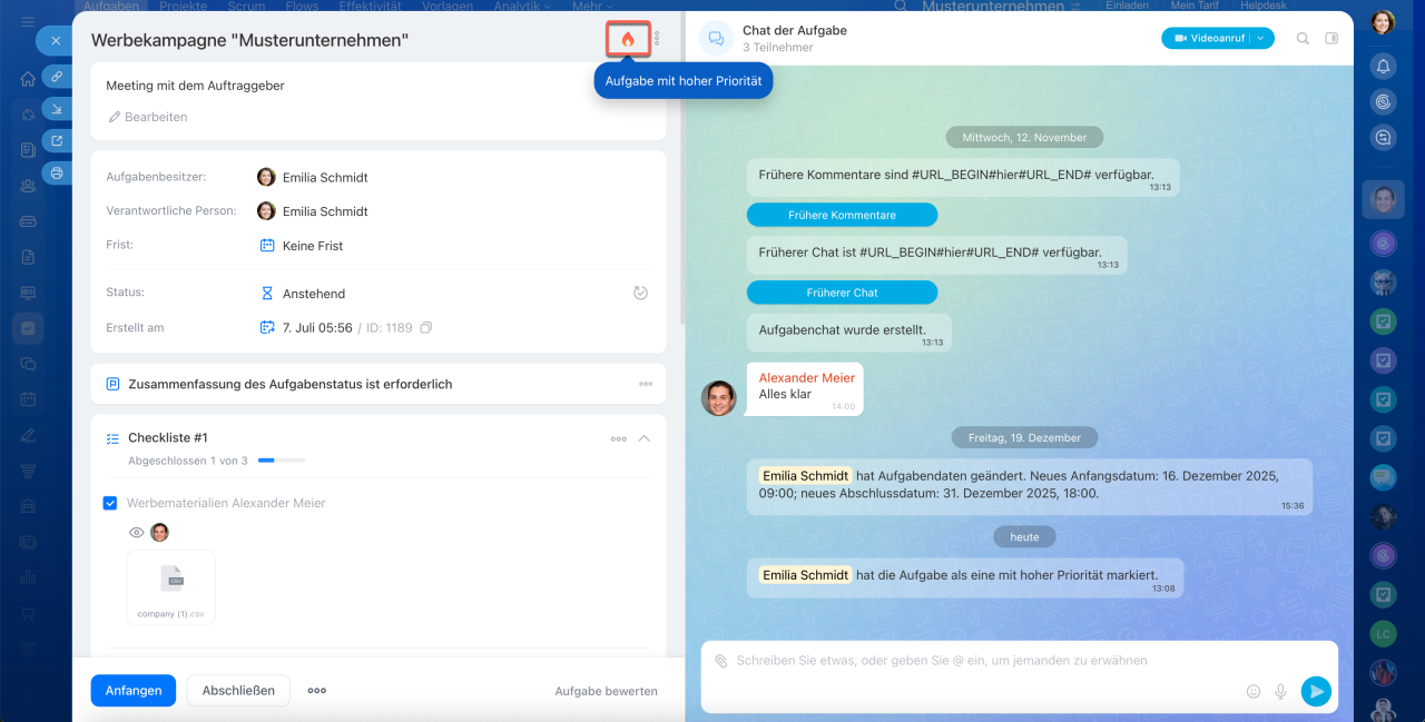 Beispielsweise erstellen Sie bei der Vorbereitung einer Werbekampagne eine Aufgabe, fügen eine detaillierte Beschreibung und eine Frist hinzu, verknüpfen relevante Materialien und ergänzen eine Checkliste. Das Team sieht sofort, was zu tun ist, und kann den Fortschritt Schritt für Schritt verfolgen.