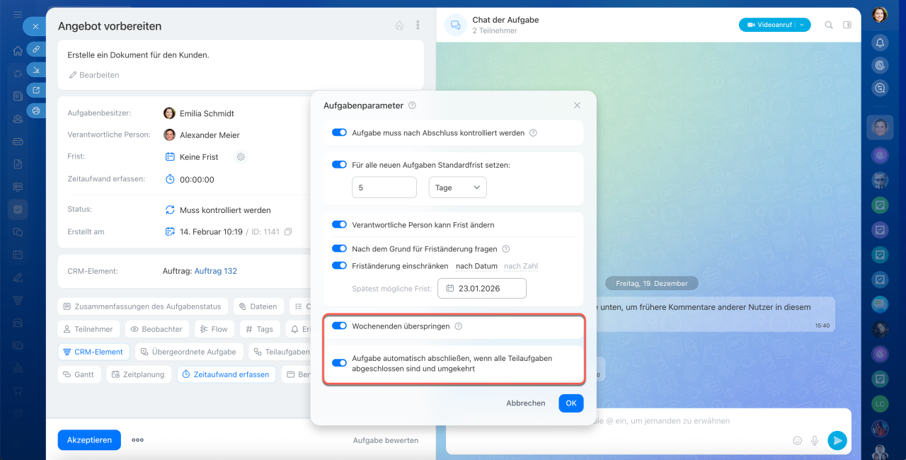 Wochenenden überspringen – Aktivieren Sie diese Option, damit die Frist automatisch auf den nächsten Werktag verschoben wird, falls sie auf ein Wochenende oder einen Feiertag fällt.