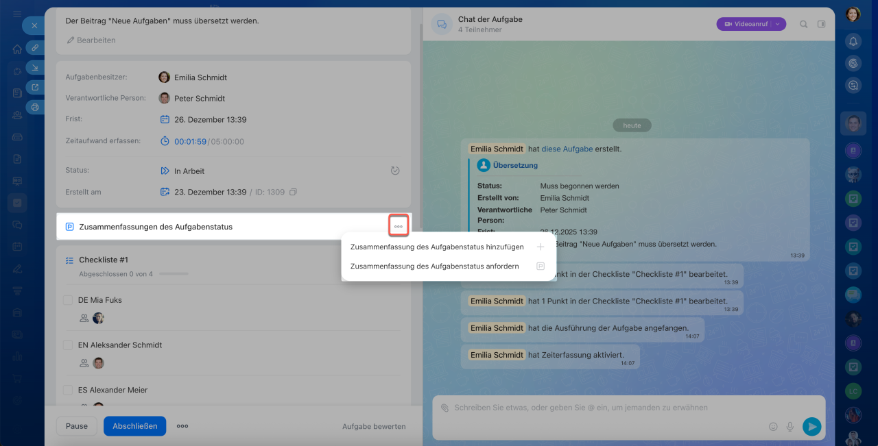 Nicht nur das Endergebnis, sondern auch wichtige Zwischenschritte können so festgehalten werden. Die Zusammenfassung fügen Sie entweder im Block Zusammenfassung des Aufgabenstatus hinzu oder als Nachricht im Aufgaben-Chat.