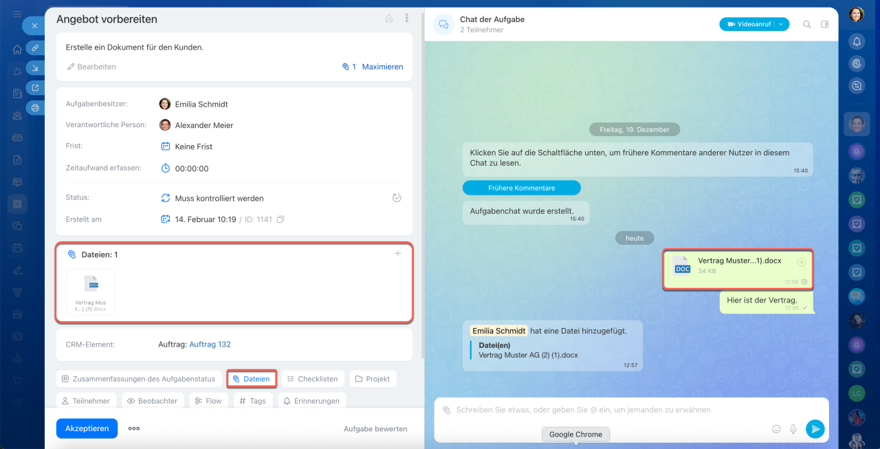 In einer Aufgabe können Sie alle zugehörigen Materialien speichern: Entwürfe, Anleitungen und andere Dokumente. Zum Beispiel kann in der Aufgabe „Vertrag prüfen“ ein Dokument angehängt werden, das Kollegen direkt aus der Aufgabe öffnen können. So arbeitet das Team mit der aktuellen Version, ohne E-Mails oder Weiterleitungen. Für schnelle Diskussionen kann die Datei direkt im Aufgaben-Chat geteilt werden.