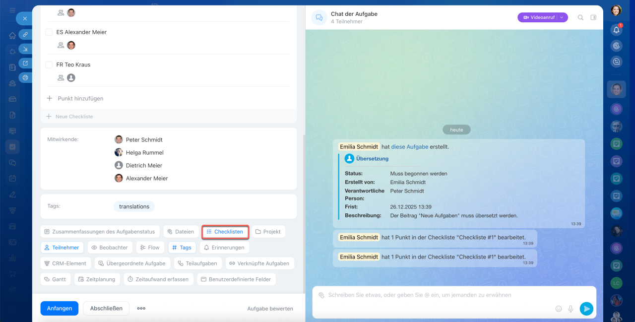 - In Bitrix24-Aufgaben können Sie zusätzliche Tools verwenden, damit das Team den Arbeitsplan übersichtlich sieht und den Fortschritt zu jedem einzelnen Punkt nachvollziehen kann.