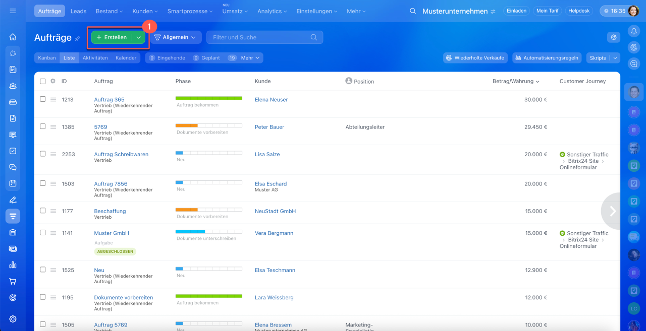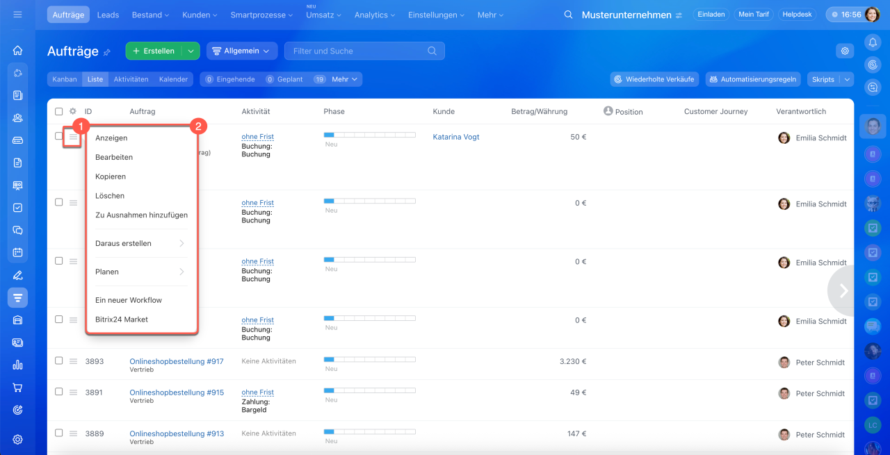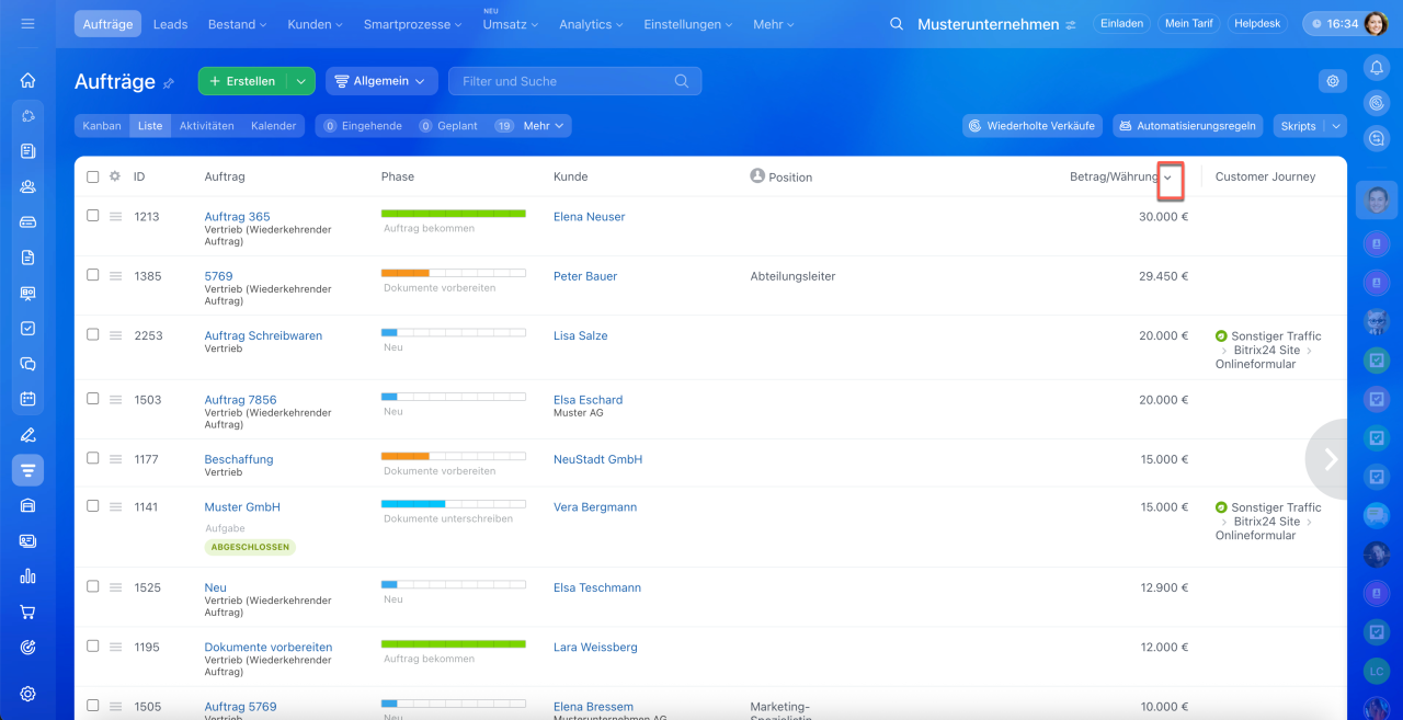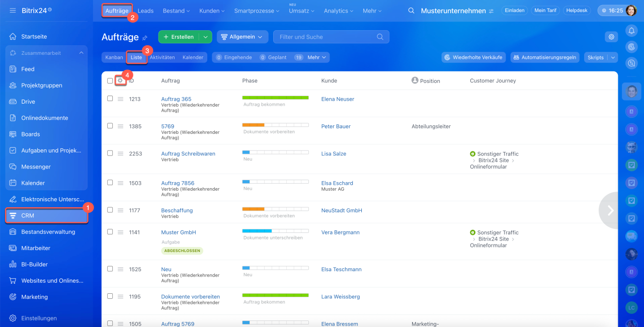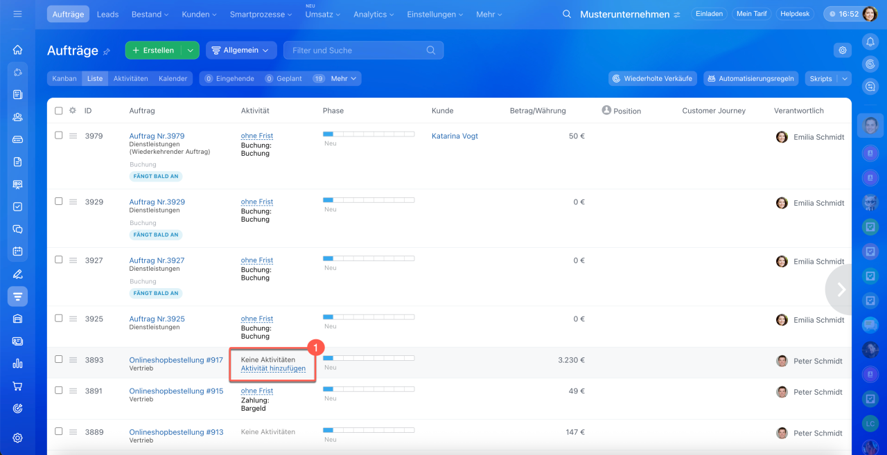 1–3. Öffnen Sie den Bereich CRM > Aufträge > Liste.