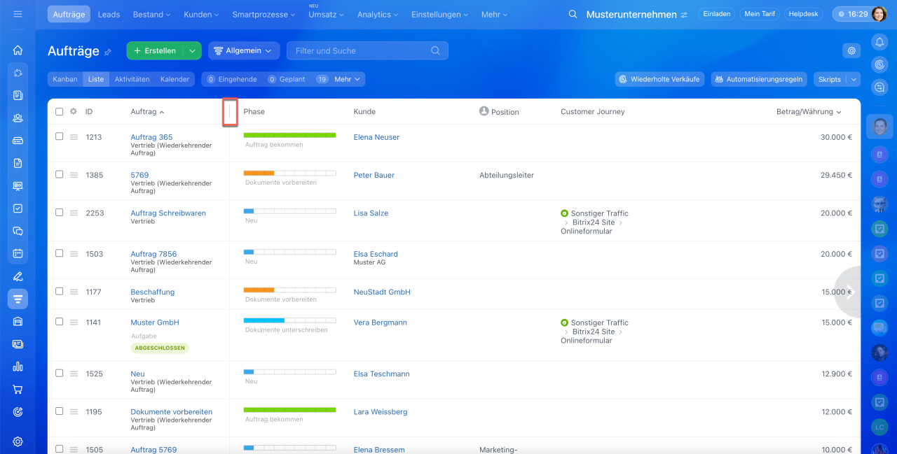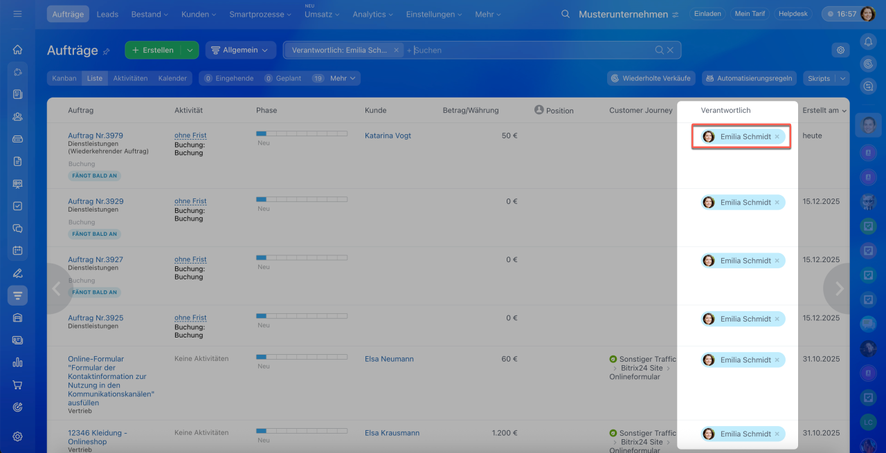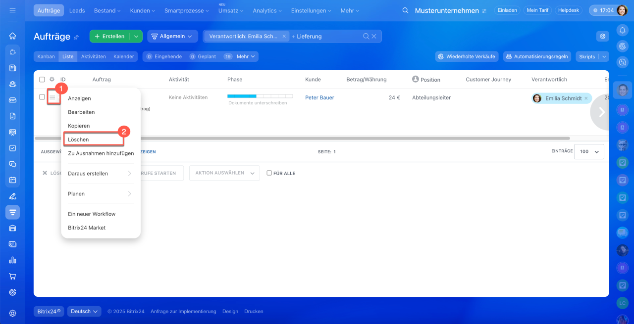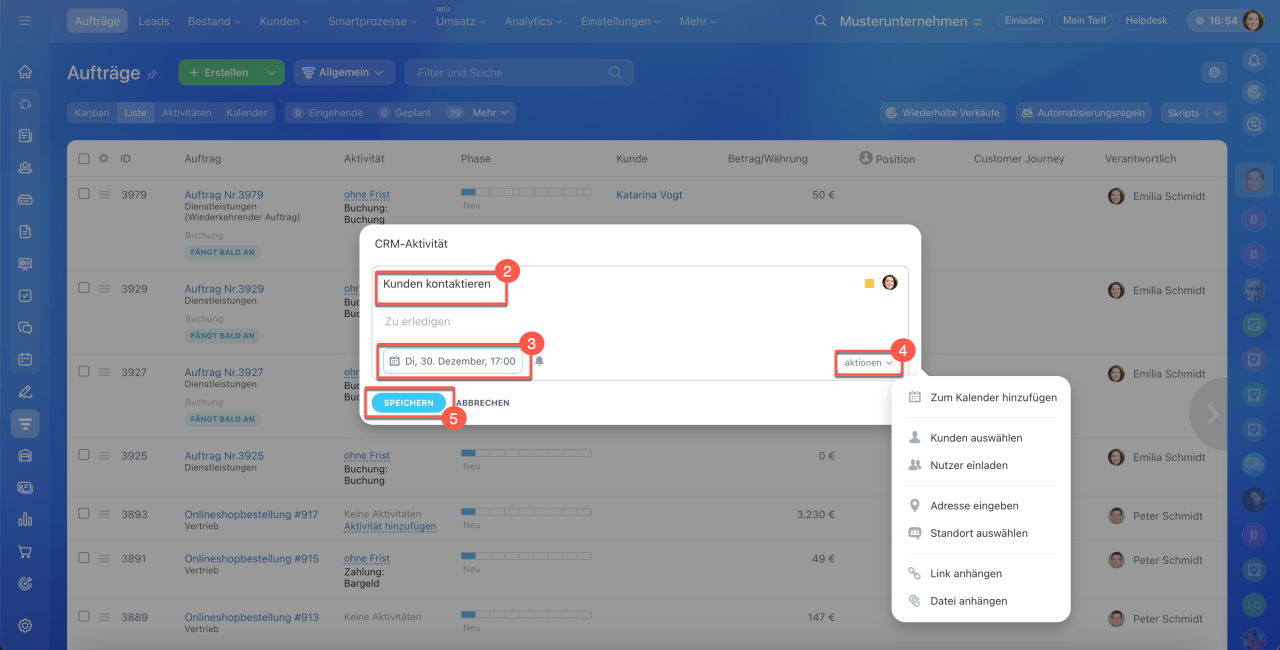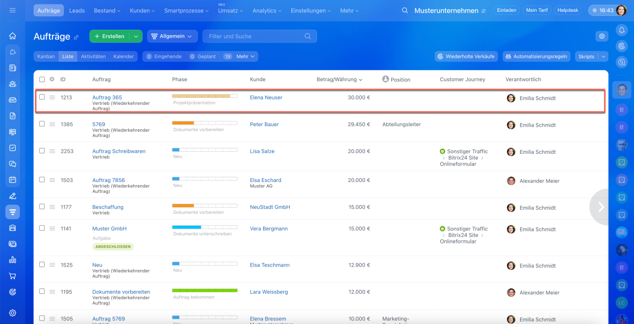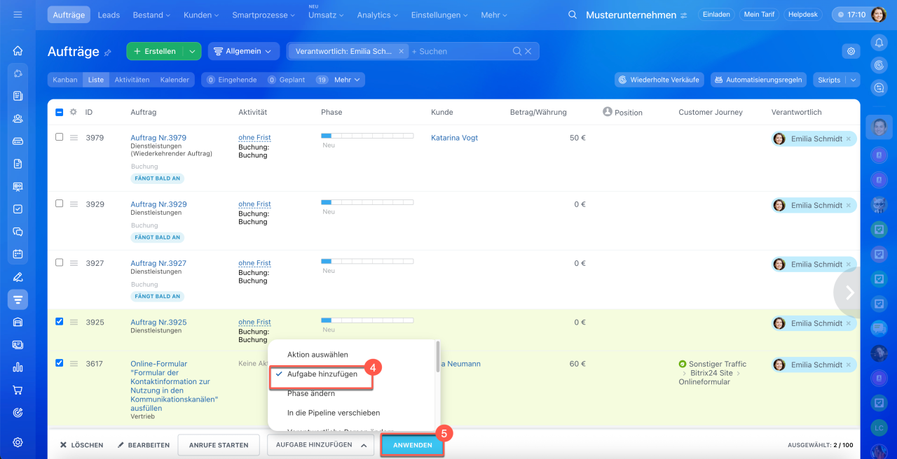 1–3. Öffnen Sie den Bereich CRM > Aufträge > Liste.