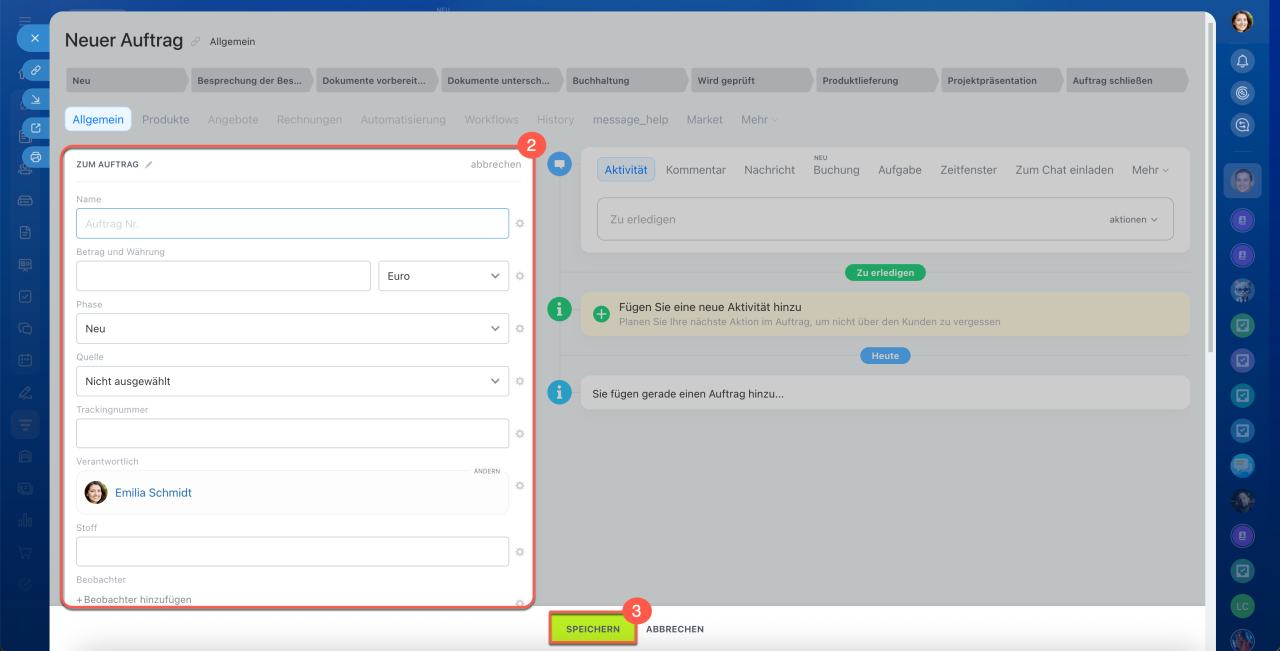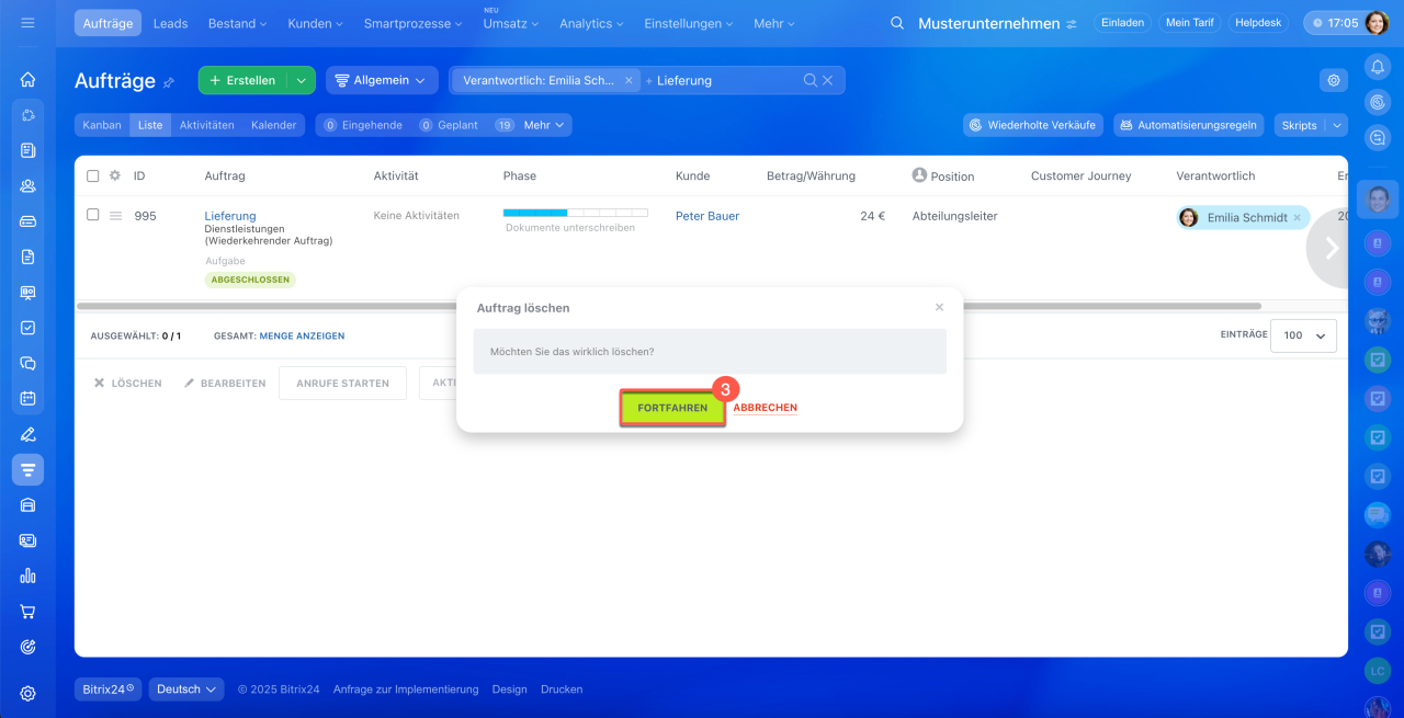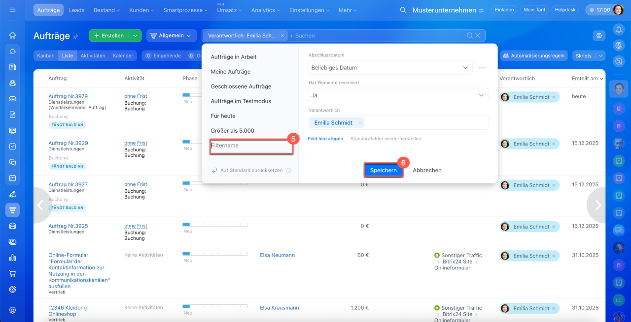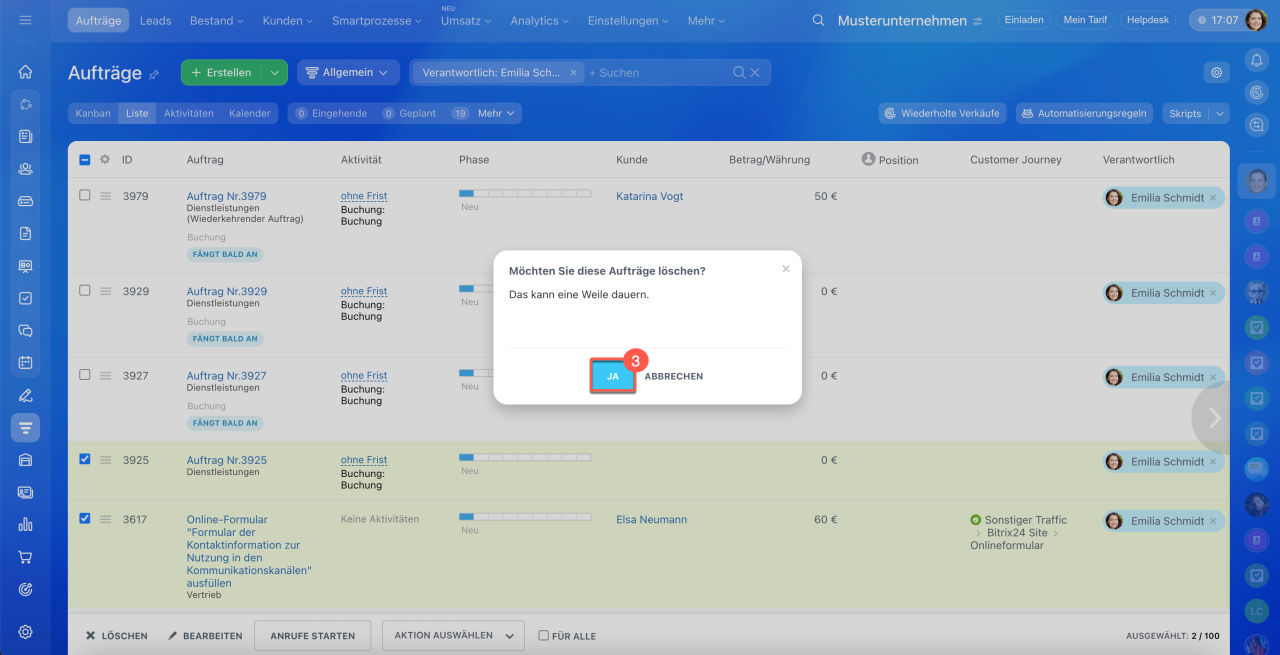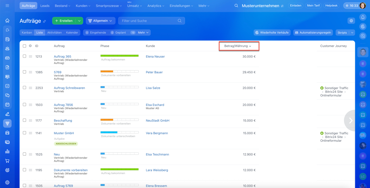 1–3. Öffnen Sie den Bereich CRM > Aufträge > Liste.