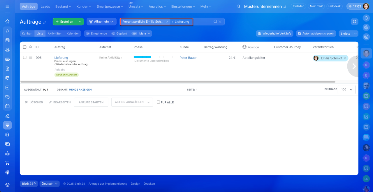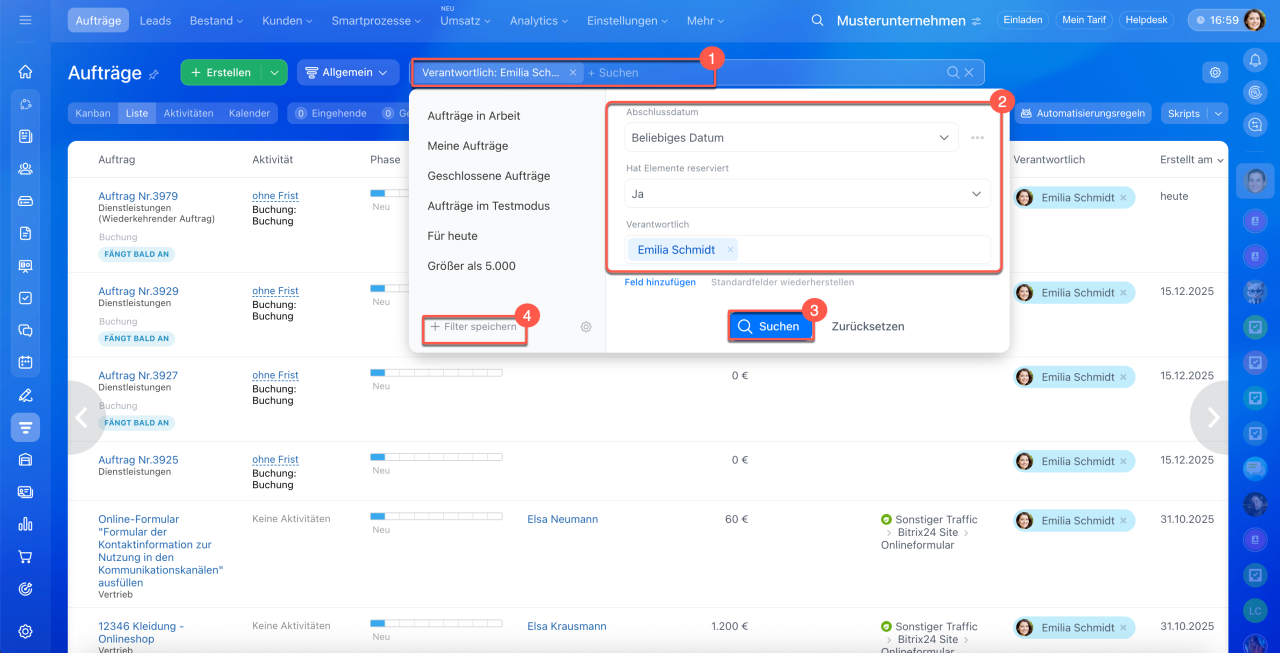 2. Wählen Sie die gewünschten Parameter aus – CRM filtert die Aufträge entsprechend.
