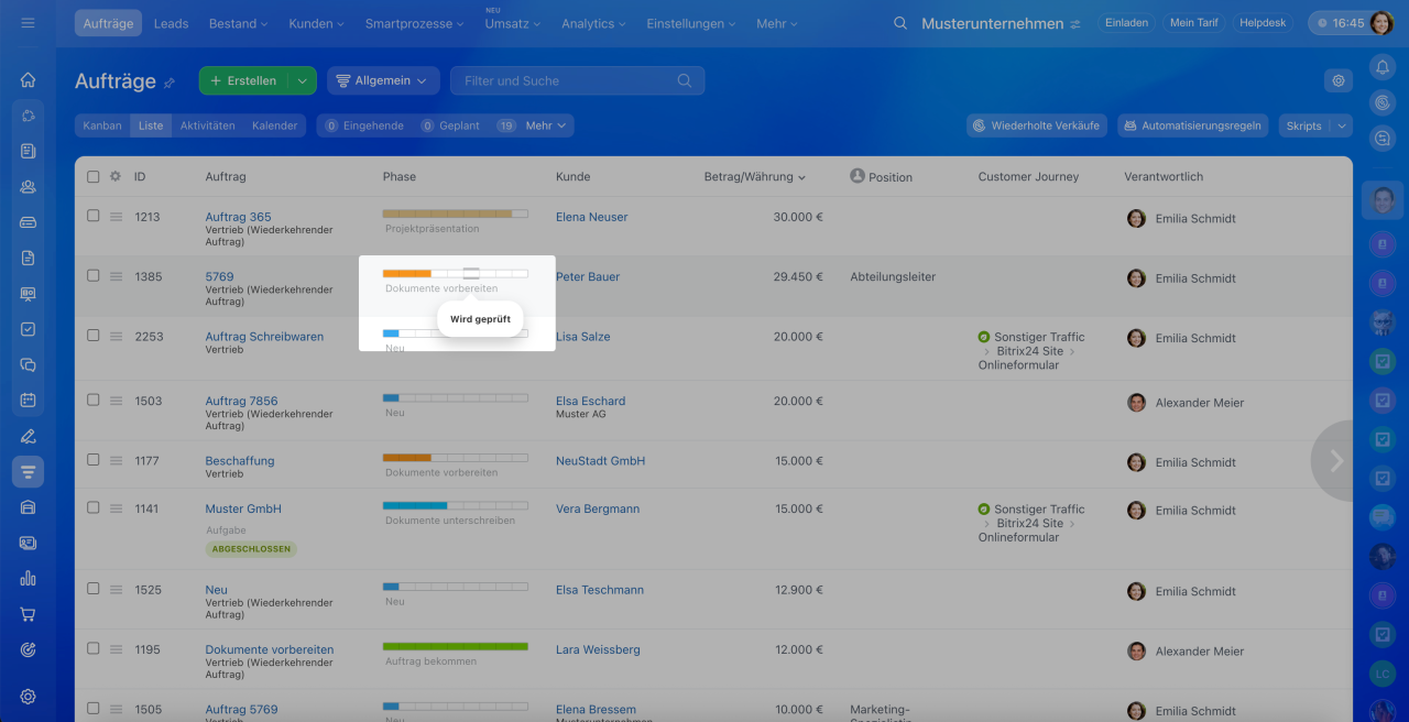 Die Liste zeigt Leads, Aufträge und andere CRM-Elemente als Tabelle mit den relevanten Informationen – Name, Phase, Erstellungsdatum, verantwortliche Person usw. Das ist praktisch, wenn Sie schnell einen Überblick erhalten oder mehrere Elemente gleichzeitig bearbeiten möchten, ohne jedes einzeln zu öffnen.